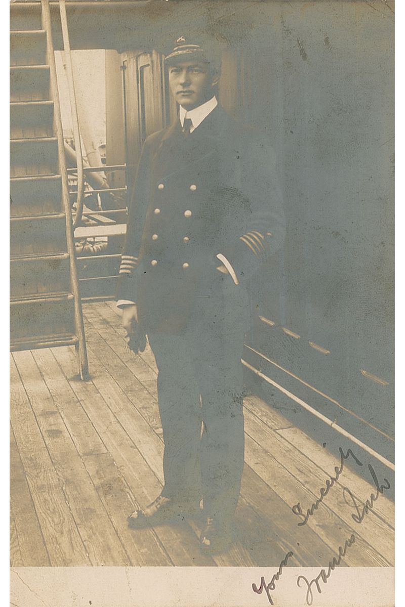 Captain of the ill-fated ocean liner S. S. Volturno, which sank in the North Atlantic in October 1913. Vintage 3.5 x 5.25 postcard photo of Inch, in his dress uniform, standing on the deck of a ship, signed in black ink, “Yours sincerely, Francis Inch.” In very good condition, with light to moderate silvering to darker areas of image and background and mounting remnants on reverse.