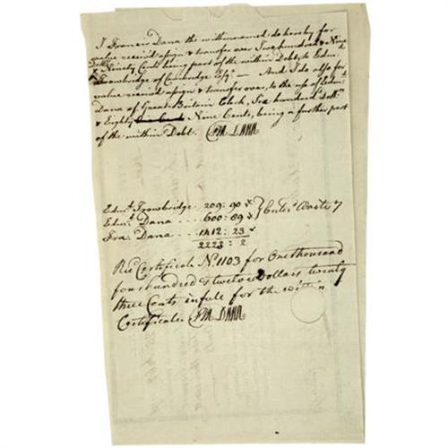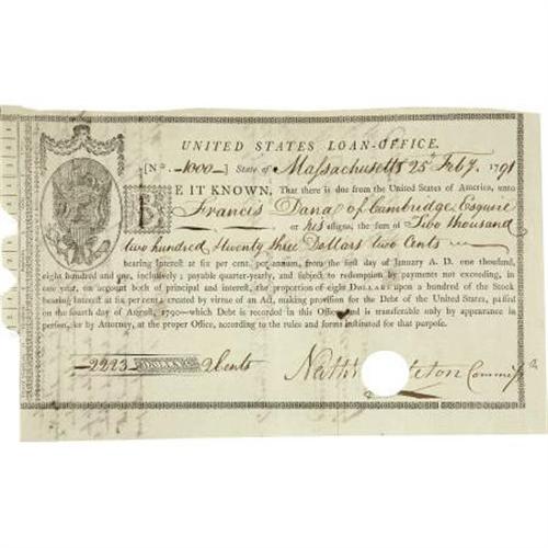 <B>Francis Dana, Signer of the Articles of Confederation, Government Bond Twice Signed</B></I> "<I>Francis Dana</B></I>". Signed on the verso of a printed United States Loan Office document, 9.25" x 5.75", Boston, February 25, 1791, bond has cancellation hole about 1" in diameter not affecting Dana's signature, else about fine. Francis Dana (1743-1811) served as a delegate to the Continental Congress from 1777 to 1178. He was a signer of the Articles of Confederation. Dana left the Continental Congress to accompany John Adams to Paris. After retirement from public life in 1806, Dana became one of the early members of the American Academy of Arts and Sciences.<BR><BR><BR><b>Shipping:</b> Flat Material, Small (<a target="_blank" href="http://www.heritageauctions.com/common/shipping.php">view shipping information</a>)