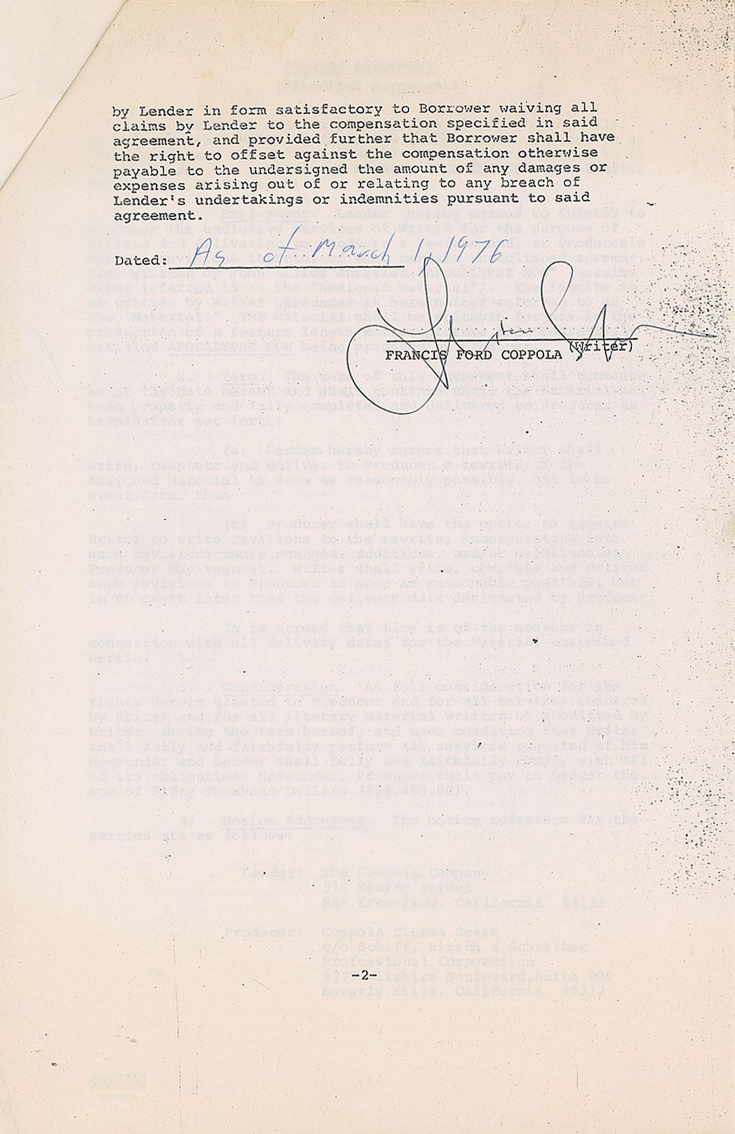 DS, two pages, 8.5 x 13, March 1, 1976. Acknowledgment for an agreement between the Coppola Cinema Seven and The Coppola Company, in which the latter agrees to furnish the exclusive services of Francis Ford Coppola "for the purpose of writing and delivering to [Coppola Cinema Seven] a rewrite and…revisions thereto, of that certain unpublished screenplay written by John Milius entitled 'Apocalypse Now.'" Signed at the conclusion in black ballpoint by Coppola. Includes the four-page "Writing Agreement" and a nine-page packet entitled "Standard Terms of Writing Employment." In fine condition. Accompanied by a certificate of authenticity from PSA/DNA.