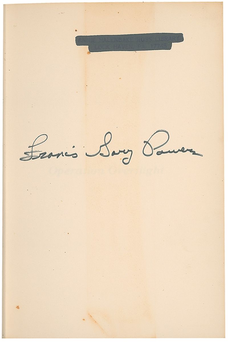 American military pilot (1929–1977) who attained wordwide notoriety in 1960 when the U-2 spy plane he was piloting was shot down over the Soviet Union, in one of the most acutely embarrassing incidents of the Eisenhower administration. Powers was killed in 1977 when the news helicopter he was flying ran out of fuel and crashed a few miles from the airport. Signed book: Operation Overflight. First edition, first printing. NY: Holt, Rinehart and Winston, 1970. Hardcover with dustjacket, 5.75 x 8.5, 375 pages. Signed on the first free end page in black felt tip. In very good condition, with scattered toning and soiling, blacked out library markings on first free end page, adhesive remnants to rear free end page, and dustjacket adhered to pastedowns.