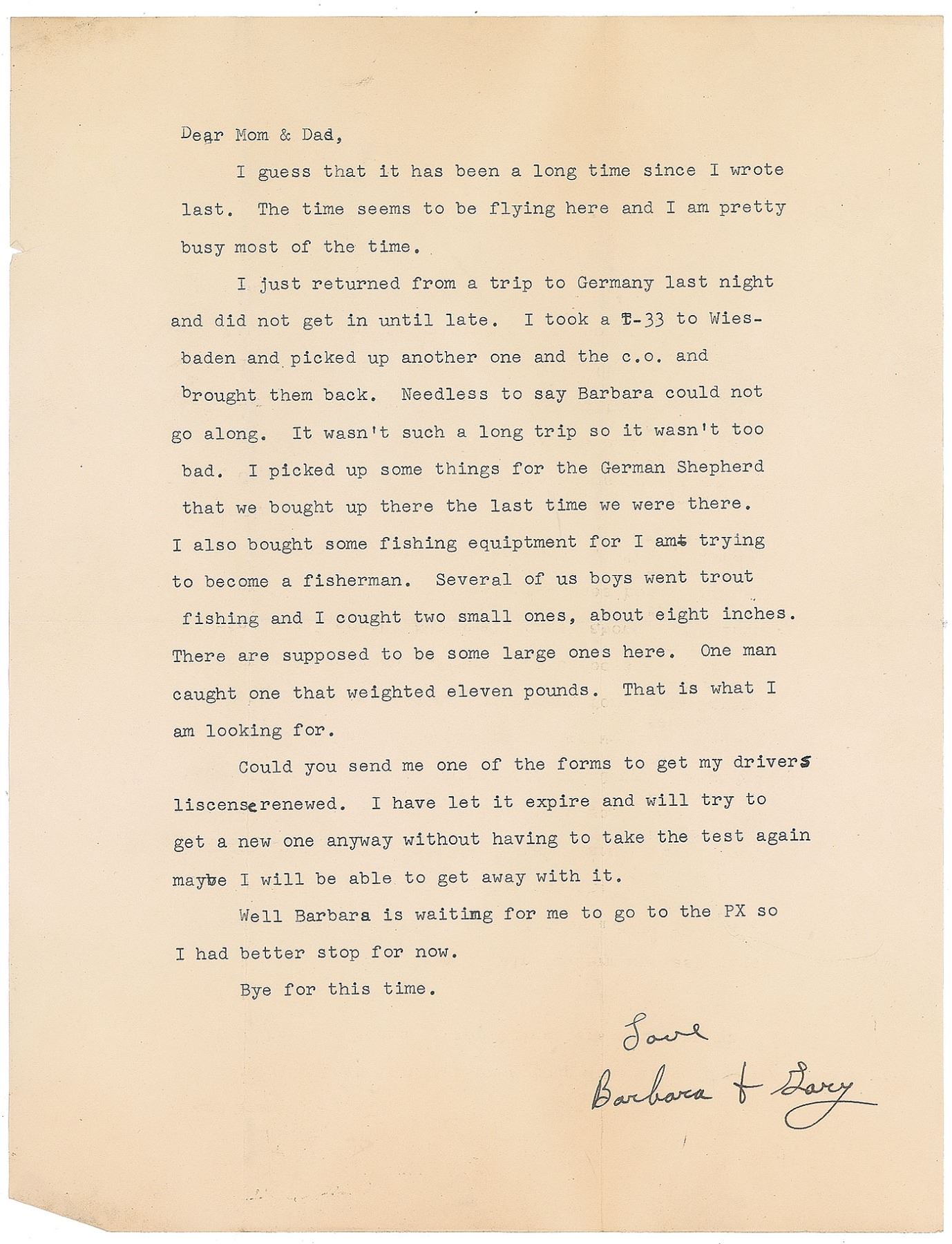 American military pilot (1929-1977) who attained worldwide notoriety in 1960 when the U-2 spy plane he was piloting was shot down over the Soviet Union; his release negotiation was the inspiration for the Oscar-winning 2015 film Bridge of Spies. TLS signed “Love, Barbara & Gary,” 8.5 x 11, postmarked June 16, no year. Letter to his parents, in full: "I guess that it has been a long time since I wrote last. The time seems to be flying here and I am pretty busy most of the time. I just returned from a trip to Germany last night and did not get in until late. I took a T–33 to Wiesbaden and picked up another one and the c.o. and brought them back. Needless to say Barbara could not go along. It wasn't such a long trip so it wasn't too bad. I picked up some things for the German Shepherd that we bought up there the last time we were there. I also bought some fishing equiptment [sic] for I am trying to become a fisherman. Several of us boys went trout fishing and I cought [sic] two small ones, about eight inches. There are supposed to be some large ones here. One man caught one that weighted eleven pounds. That is what I am looking for. Could you send me one of the forms to get my drivers license renewed. I have let it expire and will try to get a new one anyway without having to take the test again maybe I will be able to get away with it. Well Barbara is waiting for me to go to the PX so I had better stop for now. Bye for this time." In fine condition. Accompanied by the original mailing envelope.