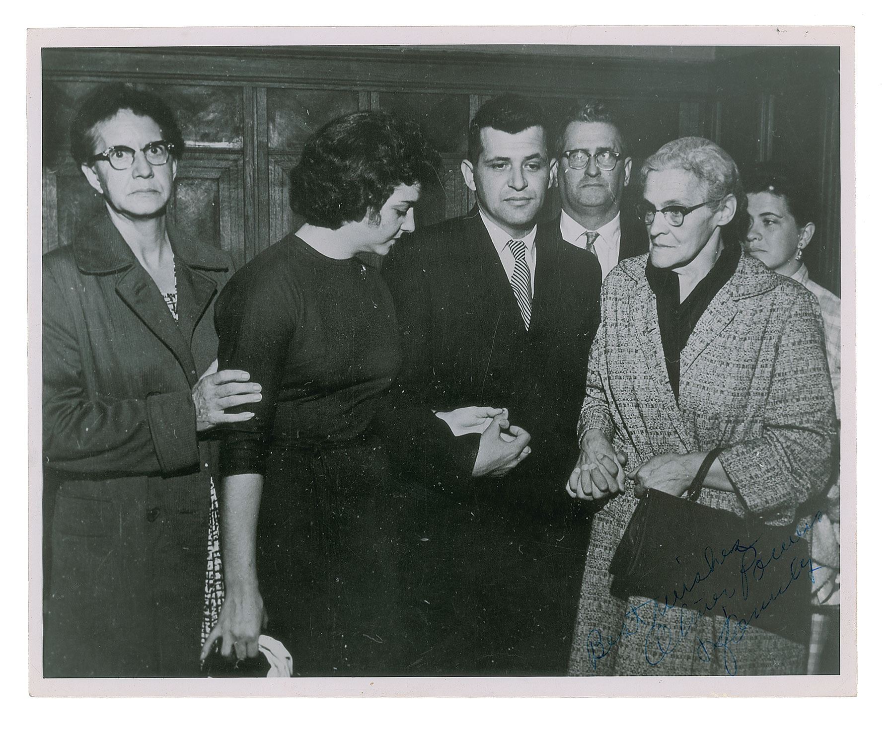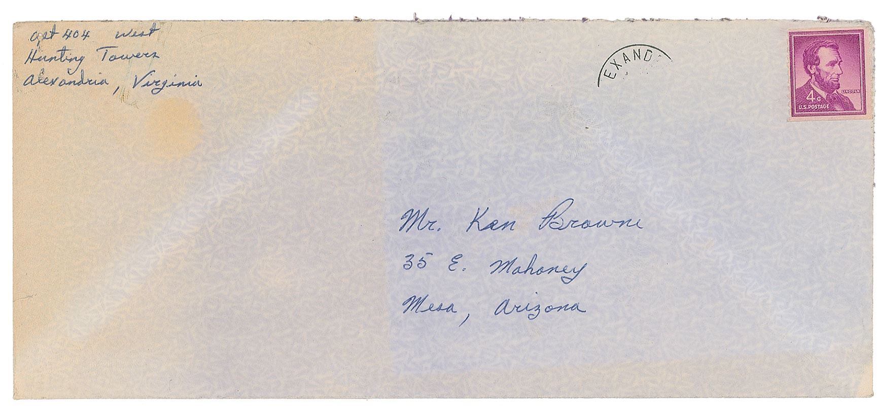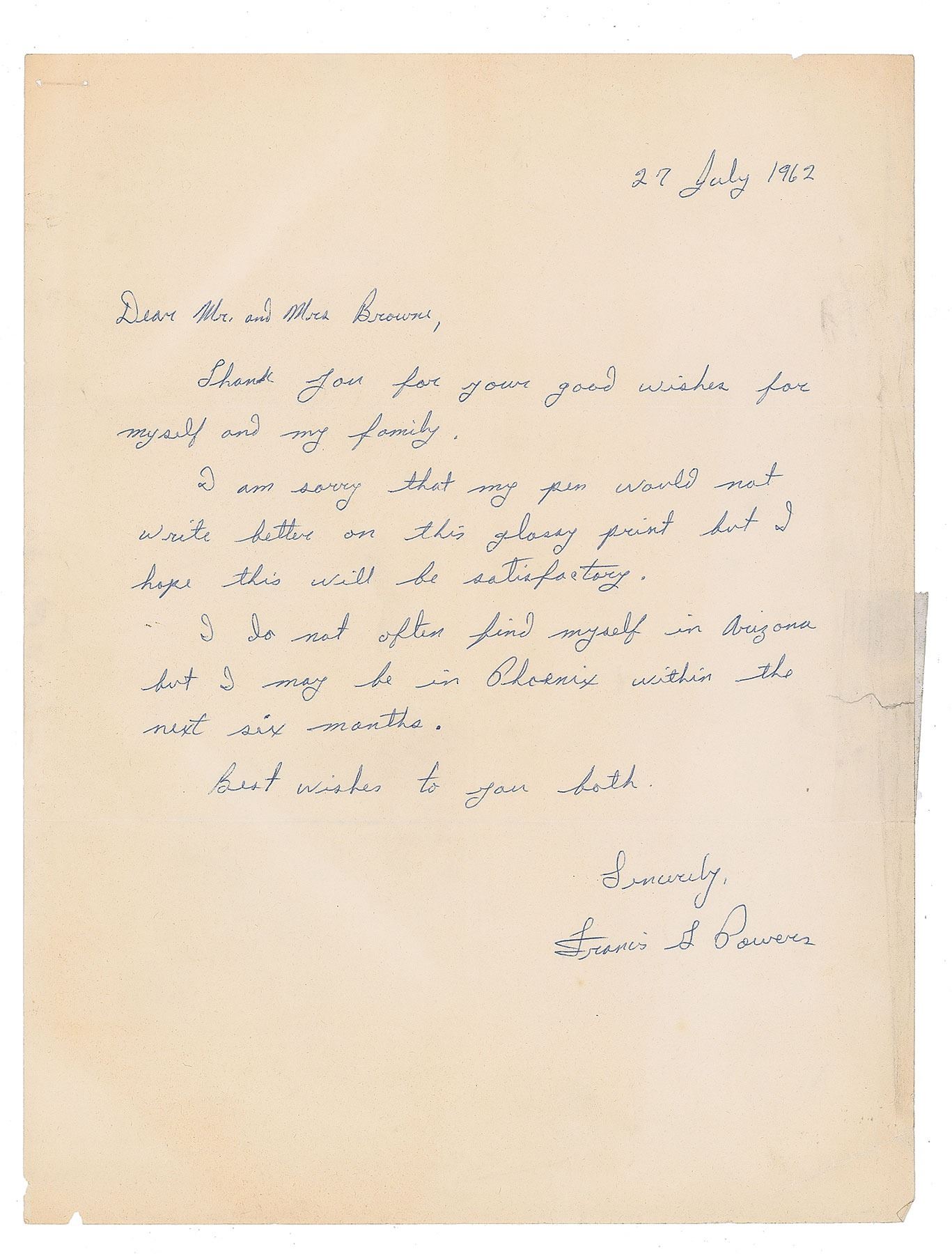 American military pilot (1929–1977) who attained worldwide notoriety in 1960 when the U-2 spy plane he was piloting was shot down over the Soviet Union. Powers was killed in 1977 when the news helicopter he was flying ran out of fuel and crashed a few miles from the airport. ALS signed "Francis G. Powers," one page, 8 x 10.5, July 27, 1962. Letter to Mr. and Mrs. Ken Browne, in part: "Thank you for your good wishes for myself and my family. I am sorry that my pen would not write better on this glossy print…I do not often find myself in Arizona by I may be in Phoenix within the next six months." In very good condition, with creasing, staple holes, and a tear to the right edge repaired on the back with old tape. Accompanied by the original mailing envelope addressed in Powers's hand, as well as a glossy photo of Powers during his sentencing in Russia, signed in ballpoint by his father, "Best wishes, Oliver Powers & family," and two ALSs by Oliver Powers.
