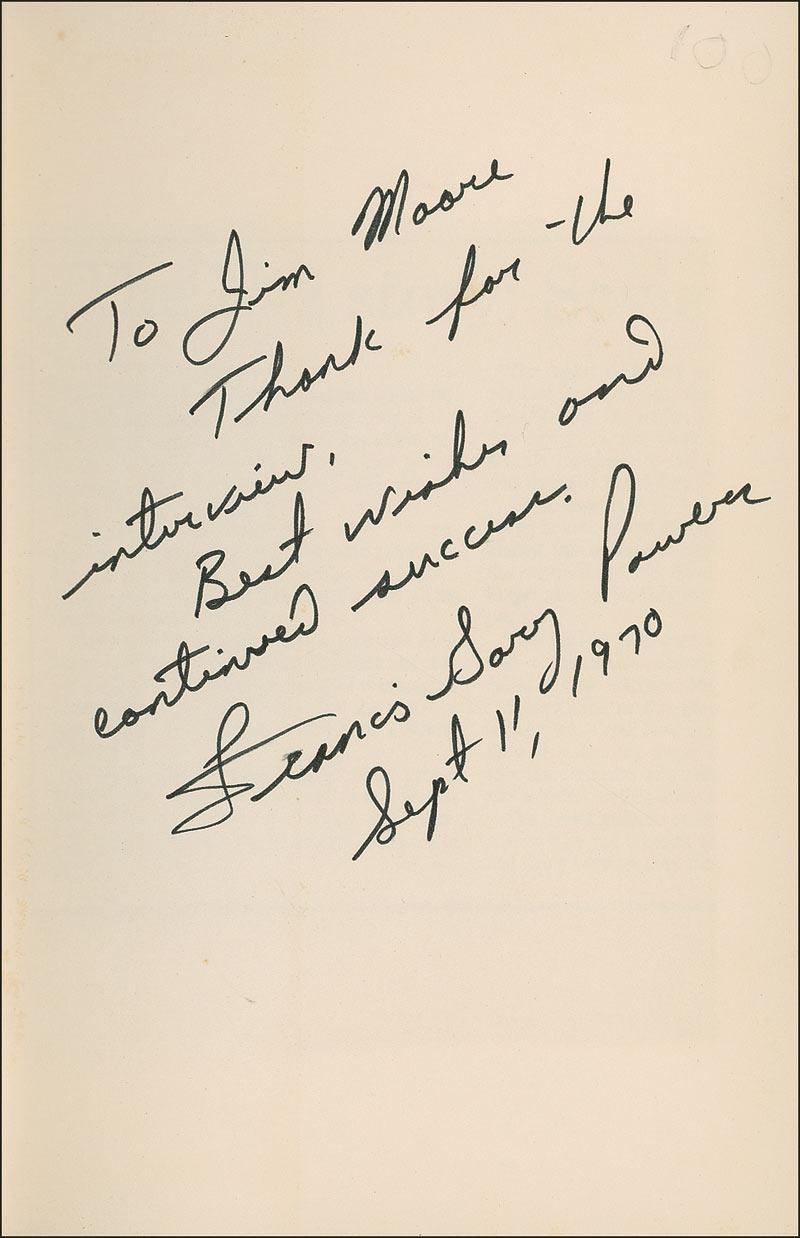 Signed book: Operation Overflight. Later printing. NY: Holt, Rinehart, and Winston, 1970. Hardcover with dustjacket, 6 x 8.5, 375 pages. Signed and inscribed on the first free end page, “To Jim Moore, Thanks for the interview. Best wishes and continued success. Francis Gary Powers, Sept. 11, 1970.” In fine condition, with price clip to dustjacket, price label to back cover, and scattered light wear and soiling to dustjacket. RRAuction COA.