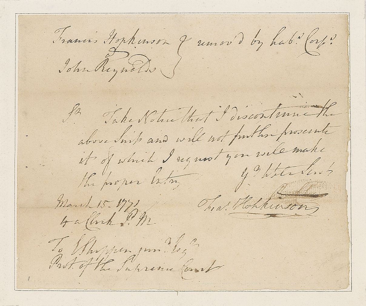ALS signed “Fra's Hopkinson,” one page, 6.25 x 5.25, March 15, 1771. Letter to Edward Shippen IV, prothonotary of the supreme court, regarding a case against John Reynolds, in full: "Take Notice that I discontinue the above Suit and will not further prosecute it of which I request you will make the proper Entry." Professionally inlaid into a slightly larger sheet. In fine condition.