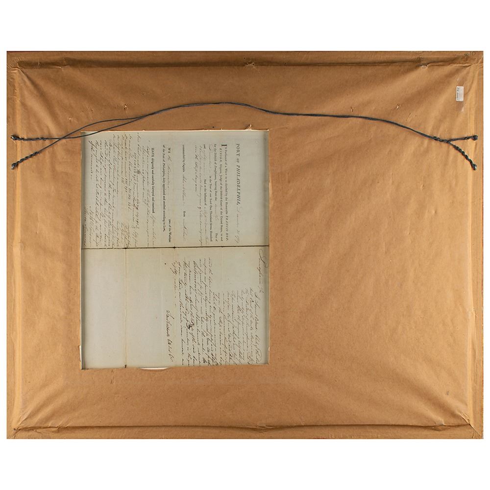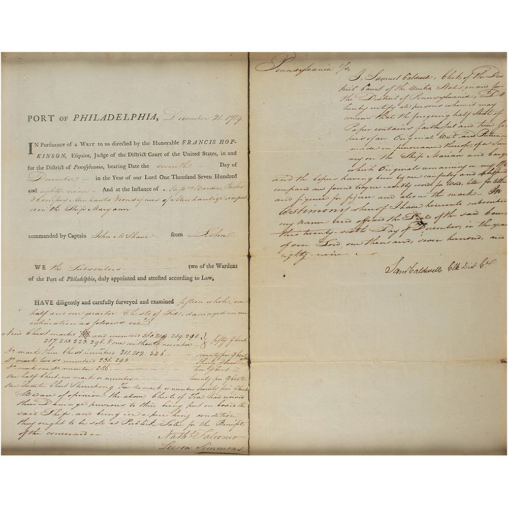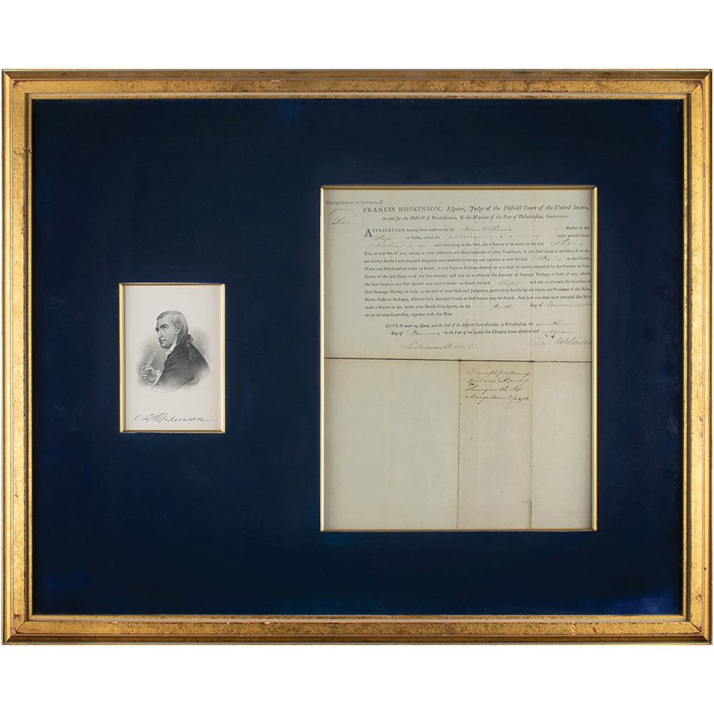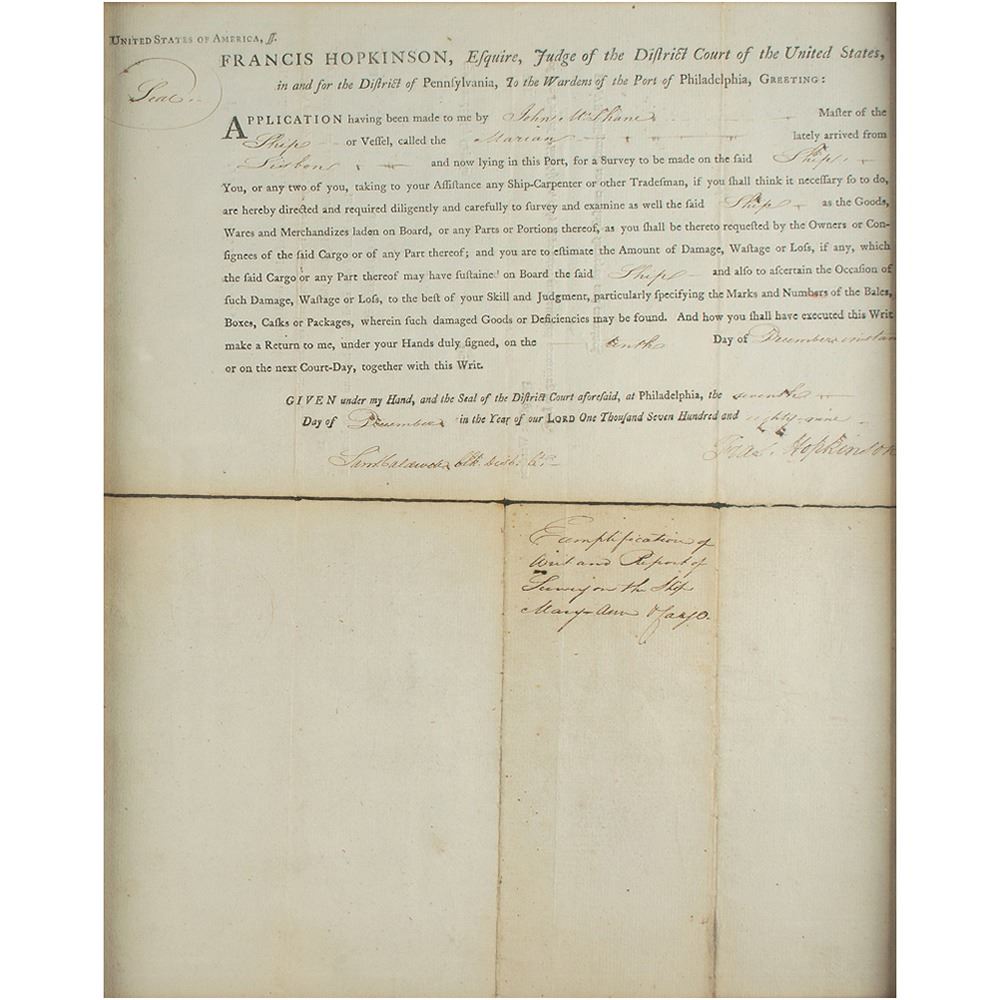 Partly-printed DS, signed “Fras. Hopkinson,†one page, 12 x 15, December 7, 1789. Order issued to the wardens of the port of Philadelphia, in part: "Application having been made to me by John McShane, Master of the Ship or Vessel, called the Marian lately arrived from Lisbon and now lying in the Port, for a Survey to be made on the said Ship, You, or any two of you, taking your assistance any Ship-Carpenter or other Tradesman, if you shall think it necessary to do so, are hereby directed and required diligently and carefully to survey and examine as well the said Ship." Signed at the conclusion by Hopkinson as judge of the District Court of the United States for Pennsylvania. The survey is recorded on the reverse, noting damage to fifteen chests of tea. Impressively matted and framed alongside an engraved portrait (bearing a facsimile signature) to an overall size of 32 x 26.5, with a window in the backing for viewing the reverse. In fine condition.