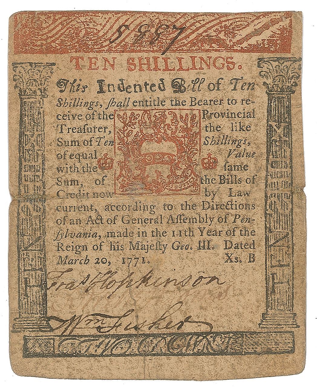 Colonial Pennsylvania engraved bank note for "Ten Shillings," signed “Fra’s Hopkinson,” 3 x 3.5, issued as No. 5887, and reading: “This Indented Bill of Ten Shillings, shall entitle the Bearer to receive of the Provincial Treasurer, the like Sum of Ten Shillings, of equal Value with the same Sum, of the Bills of Credit now by law current, according to the Directions of an Act of General Assembly of Pennsylvania, made in the 11th Year of the Reign of his Majesty Geo. III. Dated March 20, 1771.” Signed at the conclusion by Francis Hopkinson, and countersigned by William Fisher. Printed by David Hall and William Sellers, with reverse bearing the cautionary message: "To Counterfeit is Death." In very good condition, with a central horizontal fold, creasing, and overall wear.