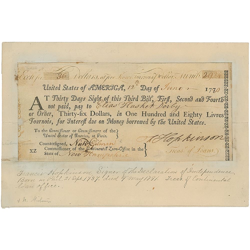 Revolutionary War-dated partly-printed DS, signed "F. Hopkinson" and "Nich. Gilman," one page, 8 x 3.75, June 12, 1780. Desirable bill of exchange, in part: "At Thirty Days Sight of this Third Bill, First, Second, and Fourth not paid, pay to Elias Hasket Derby or Order, Thirty-six Dollars, in One Hundred and Eighty Livres Tournois, for Interest due on Money borrowed by the United States." Signed at the conclusion by Hopkinson as treasurer of loans and countersigned by Nicholas Gilman as commissioner of the Continental Loan-Office of New Hampshire. Inlaid into a scrapbook page. In fine condition, with some light creasing and soiling. Hopkinson signed the Declaration of Independence as a delegate from New Jersey, while Gilman served in the Continental Army and signed the Constitution as a delegate from New Hampshire.