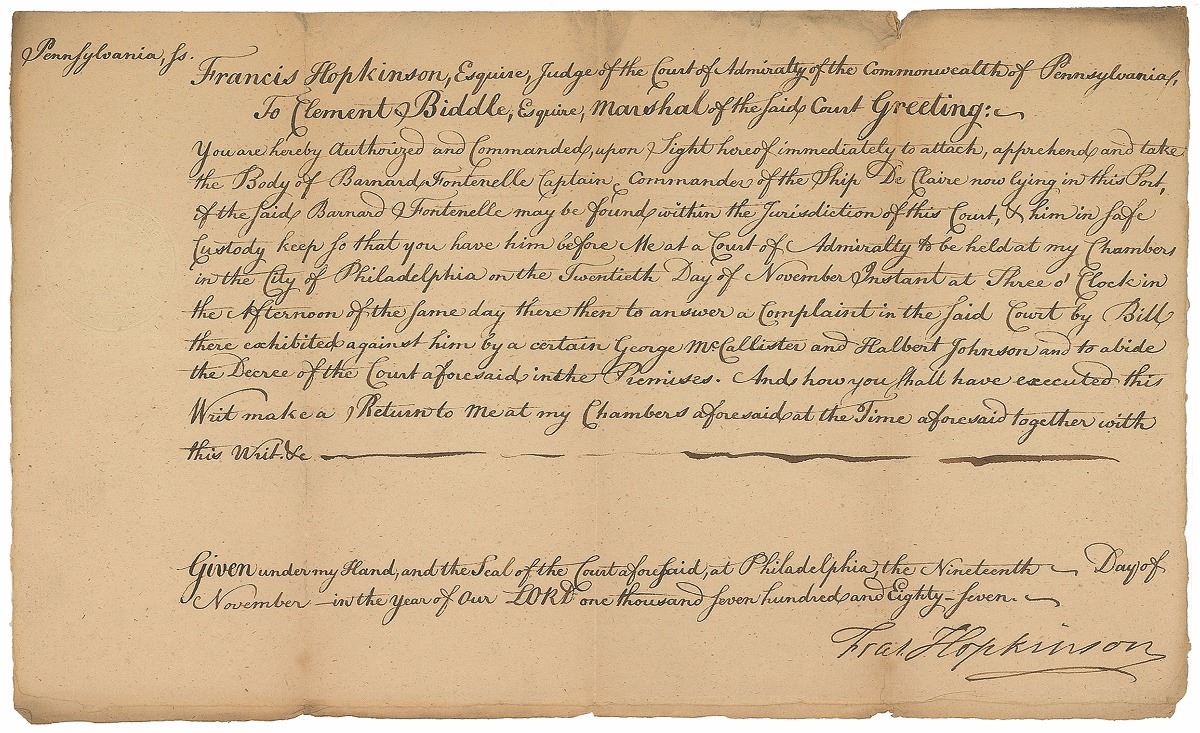 Manuscript DS, signed “Fras. Hopkinson,” one page, 13.5 x 8.25, November 19, 1784. As judge of the Court of Admiralty of the Commonwealth of Pennsylvania, Hopkinson issues an arrest warrant to Marshal Clement Biddle. In part: “You are hereby Authorized and Commanded…to attach, apprehend and take Body of Barnard Fontenelle, Captain, Commander of the Ship De Claire now lying in this Port…so that you have him before Me at a Court of Admiralty to be held at my Chambers.” In fine condition.