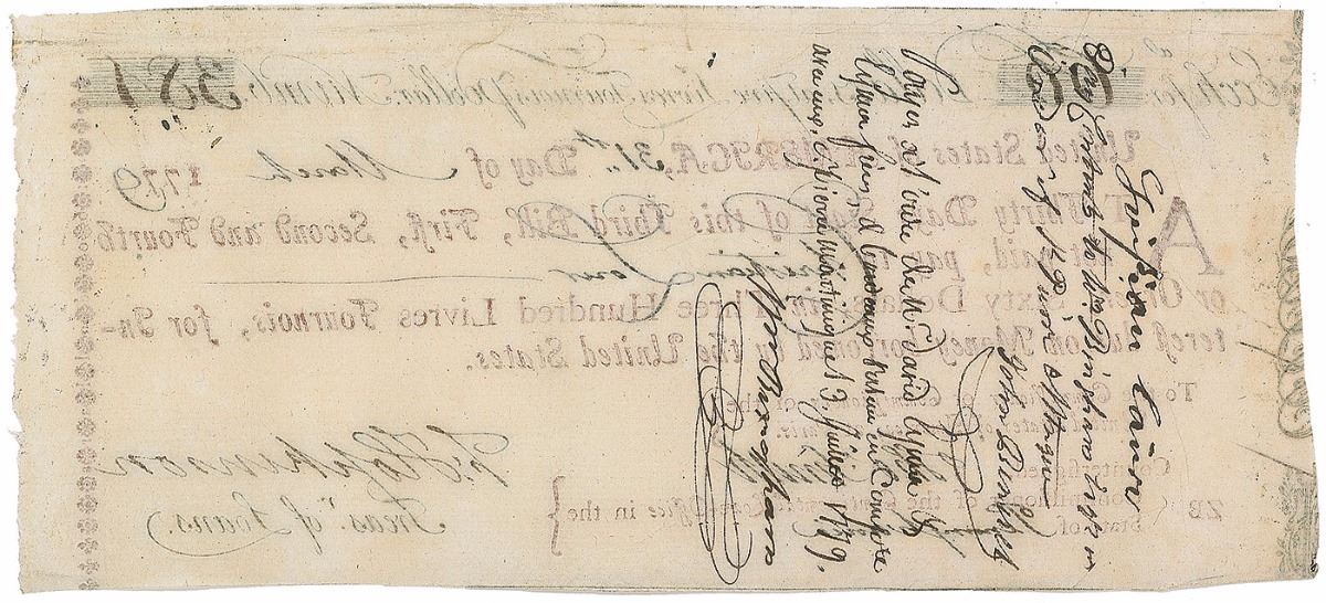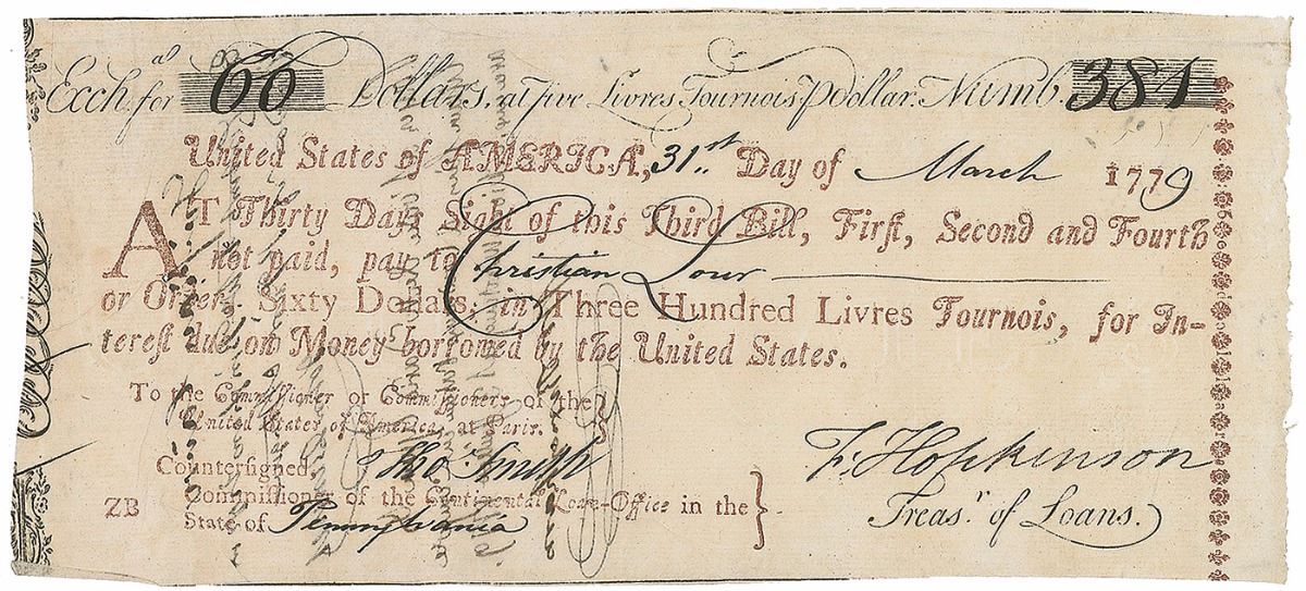 Revolutionary War–dated partly-printed DS, signed “F: Hopkinson,” one page, 8.25 x 3.75, March 31, 1779. United States bill of exchange, in part: "At Thirty Days Sight of this Third Bill, First, Second and Fourth not paid, pay to Christian Lour or Order, Sixty Dollars, in Three Hundred Livres Tournois, for Interest due on Money borrowed by the United States." Crisply signed in the lower right by Hopkinson as treasurer of loans. Also countersigned in the lower left by Thomas Smith, commissioner of the Continental Loan Office of Pennsylvania. Endorsed on the reverse by Christian Laur, John Benezet and William Bingham. In fine condition, with endorsements showing through from the reverse.