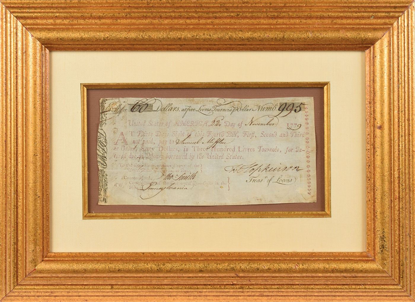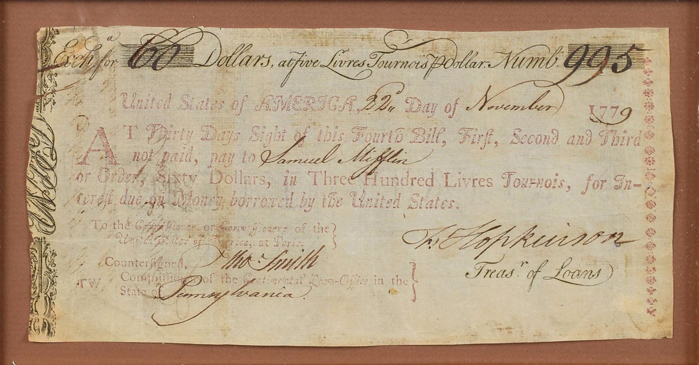 Signer of the Declaration of Independence from New Jersey (1737–1791) who is also known as the designer of the first official American flag. Partly-printed DS, signed “F. Hopkinson,” one page, 8.25 x 4, November 22, 1779. An international currency exchange document, in part: “At Thirty Days Sight of this Fourth Bill, First, Second and Third not paid, pay to Samuel Mifflin or Order, Sixty Dollars, in Three Hundred Livres Tournois, for Interest due on Money borrowed by the United States." Neatly signed at the conclusion by Hopkinson as treasurer of loans and countersigned by Thomas Smith as commissioner of the Continental Loan-Office of Pennsylvania. Mounted, cloth-matted, and framed to an overall size of 16 x 11.5. In fine condition, with some light toning.