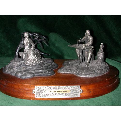A limited edition signed and numbered cast pewter sculpture titled "Letter To Sarah" by Francis J. Barnum, ca. 1993. The piece depicts the letter written by Sullivan Ballou of Rhode Island to his young wife Sarah shortly after the start of the Civil War so movingly portrayed in "The Civil War Series" by Ken Burns. Barnum's touching sculpture shows Ballou writing his wife from the battlefield on a makeshift desk, at the same time depicting Sarah just after she has read his words. Tragically, at about the same time Sarah received his letter, Sullivan Ballou was killed at the First Battle of Manassas. It is on a hardwood base with a pewter title plate. It is artist signed and is numbered 559 of a total of 707 subscribed issues. It bears the Chilmark gold button of authenticity. This sculpture has been fully subscribed and all molds and casts destroyed. It stands 5 inches tall and the base measures 10 1/2 inches long and 6 1/4 inches wide. Shipping quoted upon sale.
