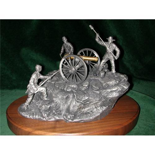 A limited edition signed and numbered cast pewter sculpture titled "Lookout Mountain" by Francis J. Barnum, ca. 2001. The piece depicts two Confederate cannoneers being assaulted by a Union infantryman on Lookout Mountain during the Battle Above The Clouds on November 24, 1863. It is on a hardwood base with a pewter title plate. The piece is artist signed and numbered 66 of 500 editions. It stands 7 inches tall and the base measures 11 1/2 inches long and 8 1/2 inches wide. Additional photo images are available upon request. Shipping quoted upon sale.
