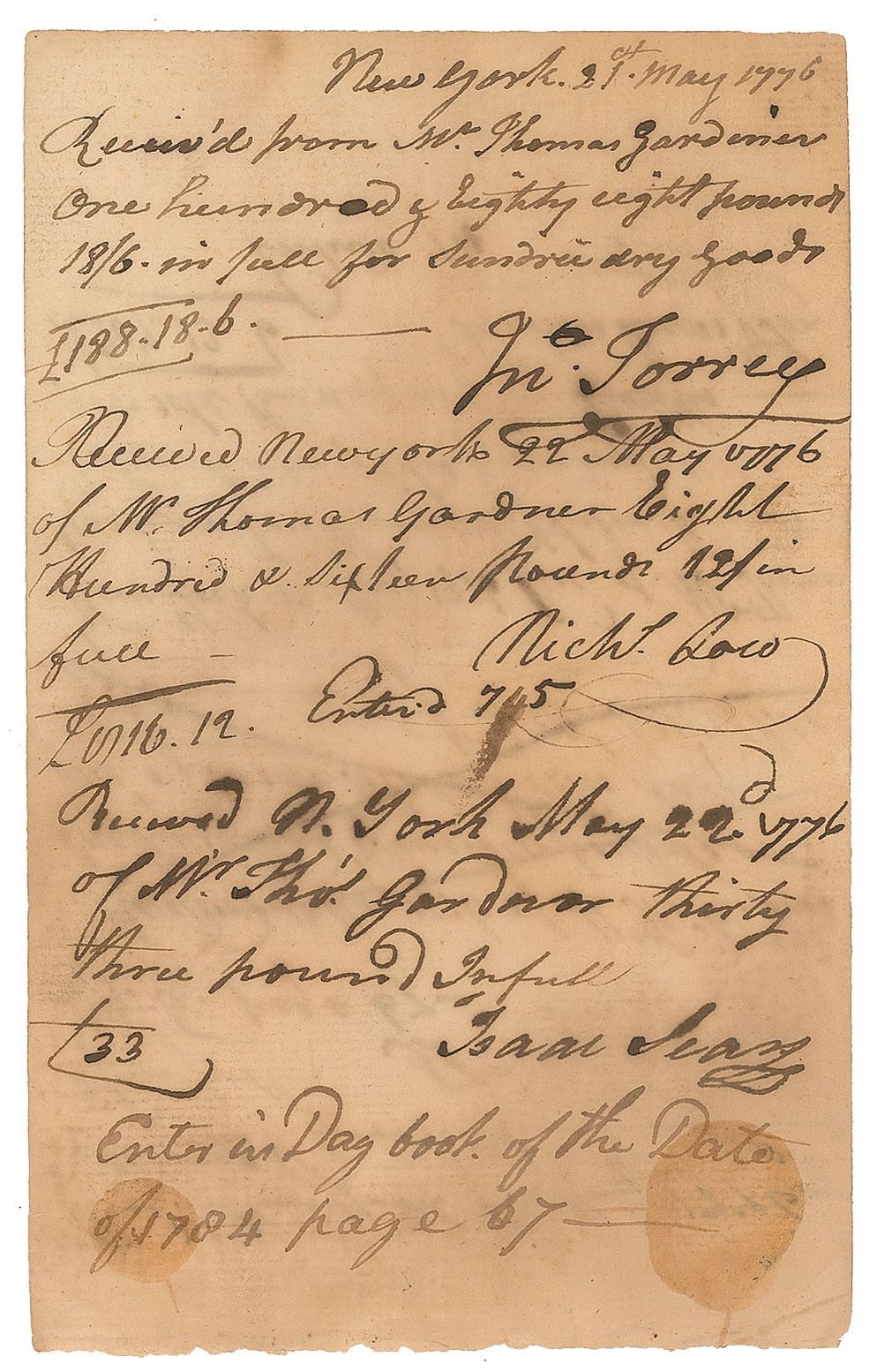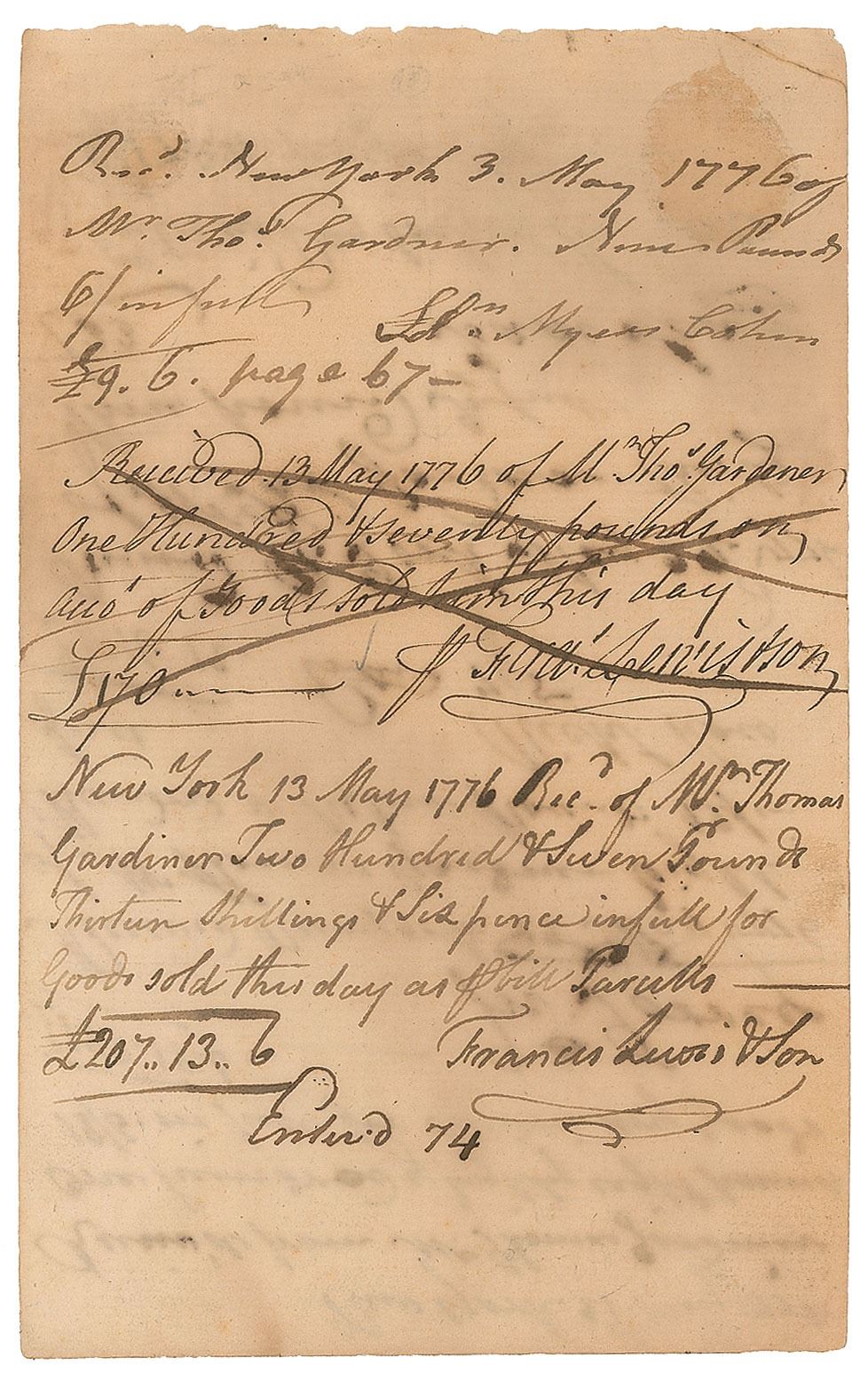 Below, his son, Francis Lewis, Jr., makes a similar entry, signed in the same manner. In full: "New York, 13 May 1776, Rec'd of Mr. Thomas Gardiner Two Hundred & Seven Pounds Thirteen Shillings & Six pence in full for Goods sold this day." In fine condition, with some scattered light toning. In his 1995 reference History Comes to Life, Kenneth Rendell places Lewis's autograph material into the 'very rare' category among the Signers; as a war-dated example boasting the iconic 1776 date, this is a particularly desirable example.