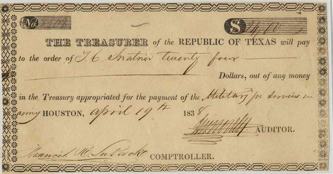 Francis Lubbock military service pay document signed as Comptroller of the Republic of Texas, dated 19 April 1838, from Houston. Countersigned by a War of 1812 Major, Wyatt Moody, as auditor. Document pays a soldier twenty-four dollars for his services in the army of the Republic of Texas. Nice, clear ''Francis R. Lubbock'' signature at bottom left. 6'' x 3.25'' document is in near fine condition with expected toning from age.
