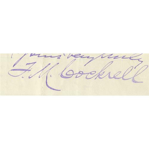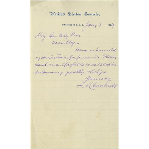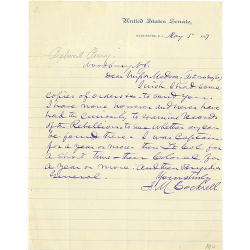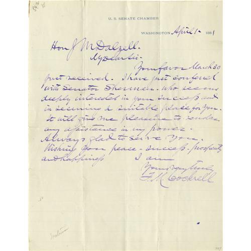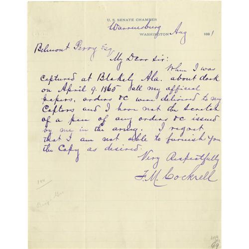 <B>Francis M. Cockrell Collection.</B></I> This lot contains eight autograph letters signed by Francis M. Cockrell. Also included are two images of Cockrell, one a photograph from a book, the other is a drawing clipped from a newspaper or pamphlet. The eight autograph letters signed date from April 1, 1881 to May 3, 1898. In all eight letters he signs himself, "<I>F.M. Cockrell.</B></I>" Francis M. Cockrell was a Confederate military commander as well as a United States Senator from Missouri, he served in this office for five terms. The letters in this collection contain routine content and the majority of them are written on United States Senate letterhead. One letter, dated August, 1881 reads in part, "<I>…When I was captured at Blakely Ala. about dark on April 9, 1865 all my official papers, orders & c. were delivered to my captors and I have not the Scratch of a pen of any orders & c. issued by me in the army…</B></I>" <BR><BR>The letters in this collection are in fine condition on average; usual folds are present; soiling has occurred on the edges of several; signatures all look bold and crisp! From the Henry E. Luhrs Collection.