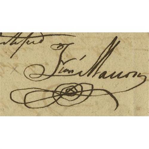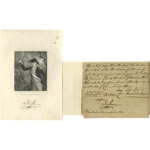 <B>Francis Marion, "The Swamp Fox": A Rare War-Date Document Signed.</B></I> Document Signed, 1 oblong page, 7.5" by 6.5", no place [South Carolina], January, 1782. In Fine condition; tipped to a larger sheet. With a handsome steel engraving of the General. Here the brilliant partisan, still campaigning against the British despite Cornwallis' surrender -- the fighting wouldn't cease in South Carolina until the British evacuated Charlestown in December 1782 -- certifies a receipt for provisions for his Dragoons. In part: "<I>This is to certify that Mr. William Richardson furnished at his plantation for the use of a party of Dragoons... forty bushels of potatoes, three thousand twenty-four sheaves of rice, and seventy one bushels of corn.</B></I>" A rare and desirable autograph. From the Henry E. Luhrs Collection. Accompanied by LOA from PSA/DNA.