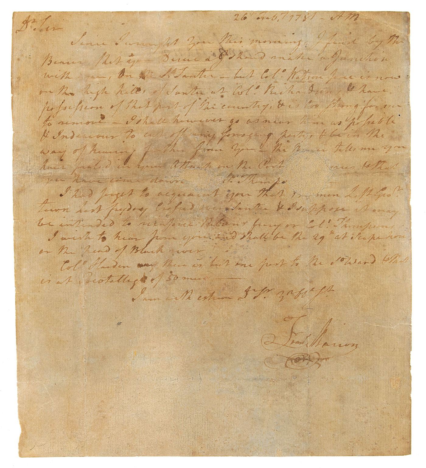 Revolutionary War–dated ALS signed “Fran. Marion,” one page, 7.25 x 8.25, February 26, 1781. Letter to Brig. Gen. Thomas Sumter, written between the battles of Cowpens and Guilford Court House. In full: "Since I wrote you this morning I find by the Bearer, that you Desire I should make a Junction with you, on the L'r Santee—but Colo. Watson force is now on the high hills of Santee at Colo. Richardsons & have possession of that part of the country, & is too strong for me to remove—I shall however go as near him as possible & Indeavor to cut off any foraging parties & be in the way of hearing further from you—The Bearer tells me you have failed in your attack in the Post[green] & that you have come down [with] Co. Thomp[son]—I had forgot to acquaint you that [150] men left Geo'r Town last fryday crossed over Santee & I suppose it may be intended to reinforce Nelson's ferry or Colo. Thompsons—I wish to hear from you and I shall be the 29th at Scapmor on the head of Black River—Colo. Hasden was there is but one part of the So. Ward & that is at Pocotallage of 50 men." In very good condition, with trimmed edges, irregular overall toning, and repairs to folds, as well as a circular area of seal-related loss which affects several words of text.