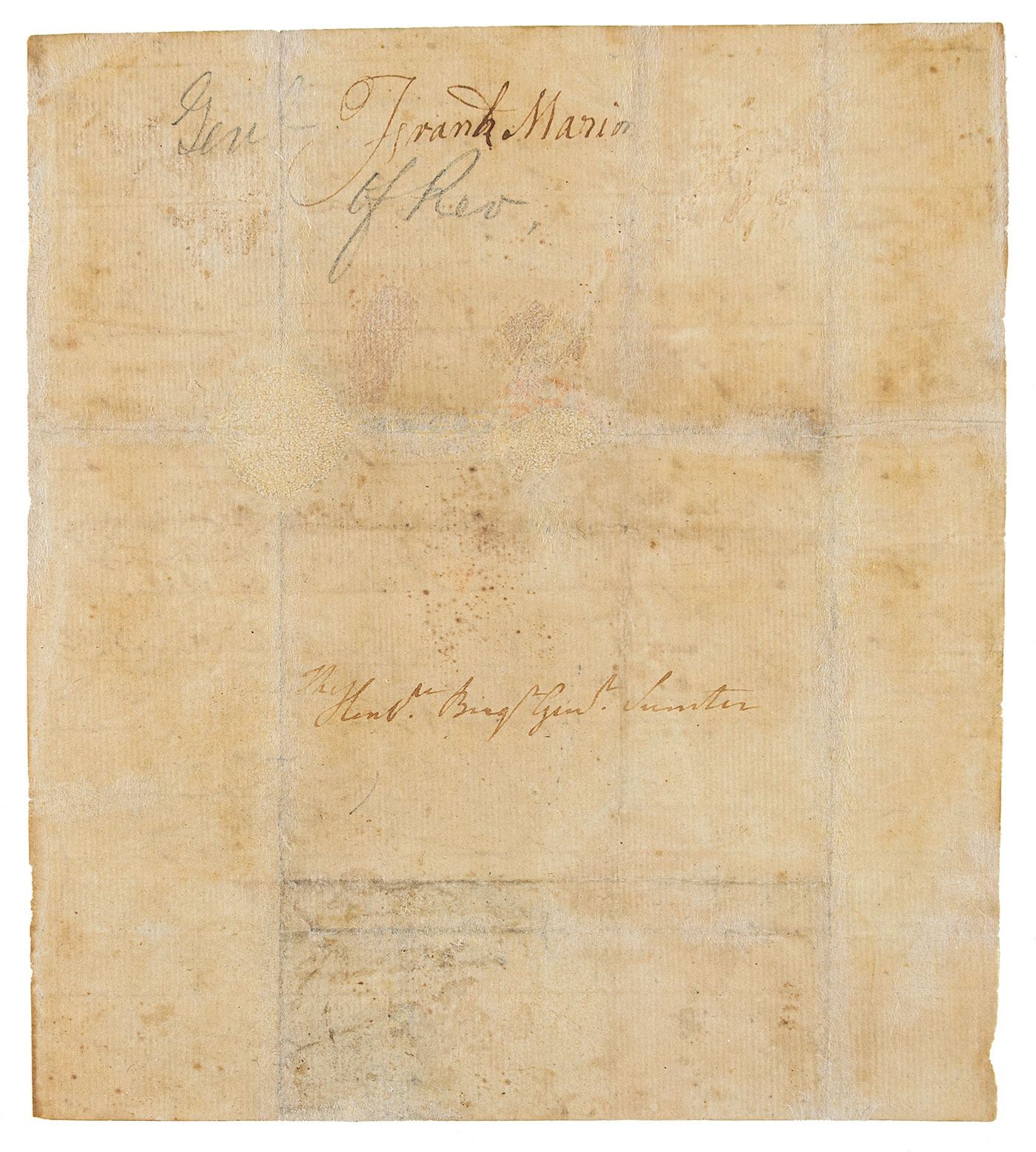 Rather than face the British head-on in frontal combat, Marion preferred to perform quick surprise attacks, followed by equally sudden withdrawal from the field. This strategy is evidenced in the present letter: rather than take on a stronger force in an attempt to meet with Sumter's force, he instead plans to pester and disrupt their smaller raiding parties. Marion's autograph is extremely rare in any form; as a battlefront letter with war-related content, this is a truly spectacular example.