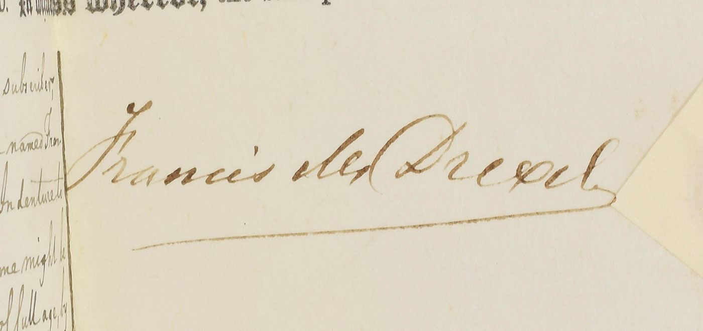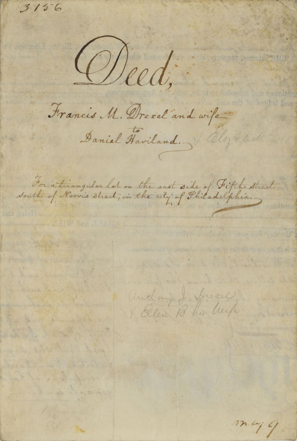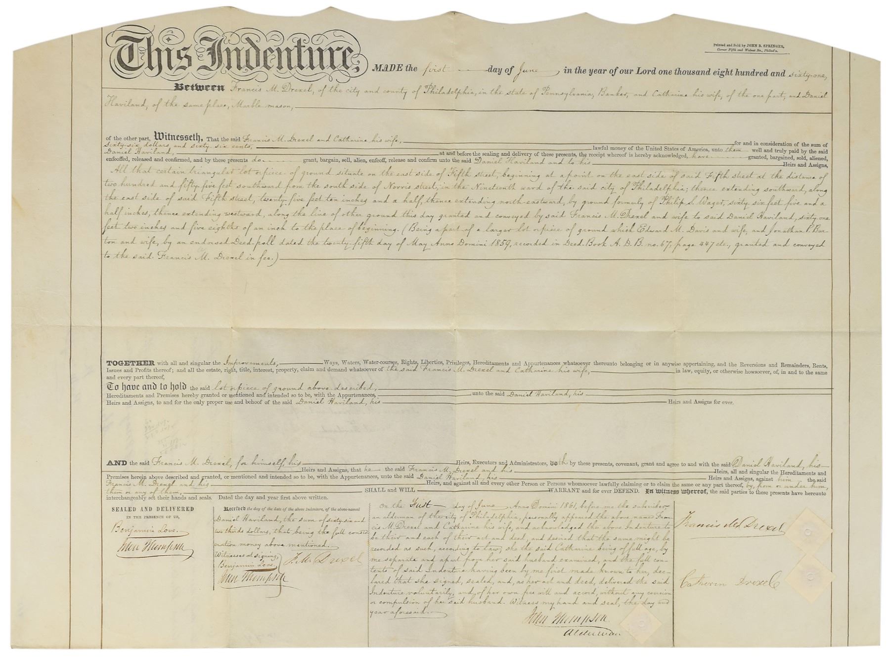 Philadelphia banker and artist (1792–1863) who founded the banking house of Drexel & Co. in 1837, which became one of the largest banks in the United States. The firm was famously forced into bankruptcy in 1990 due to illegal activities in the junk bond market. Extremely rare partly-printed vellum DS, signed “Francis M. Drexel,” one page, 23.5 x 17.5, June 1, 1861. Indenture by which Drexel and his wife sell a "triangular lot on the east side of Fifth street south of Norris street, in the city of Philadelphia" to Daniel Haviland in consideration of the sum of $66.66. Signed at the conclusion by Francis M. Drexel and Catherine Drexel. In fine condition.
