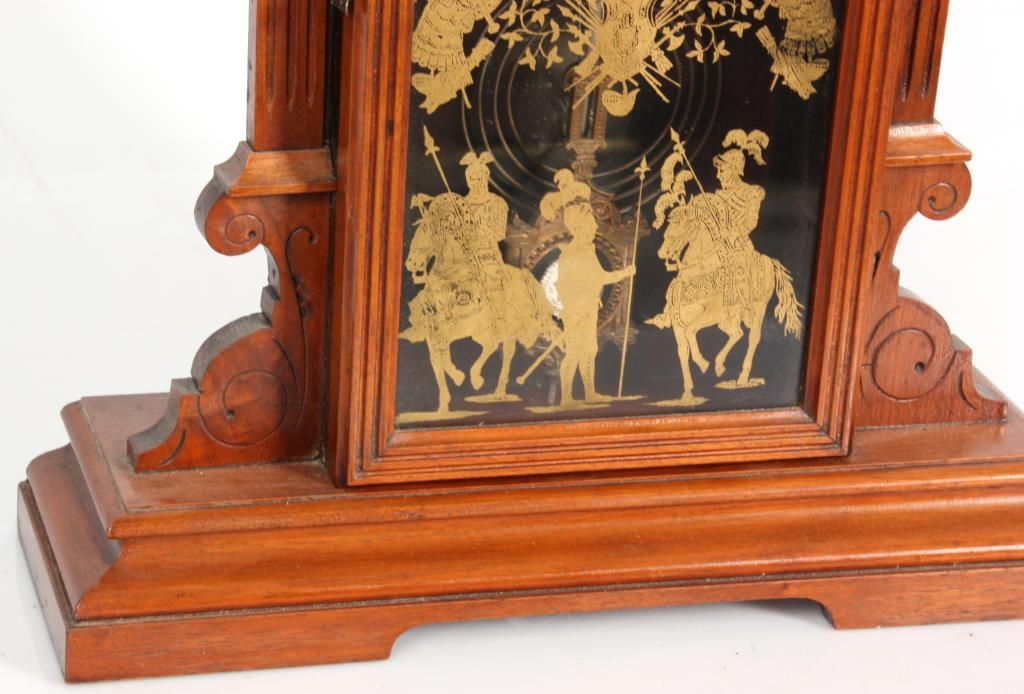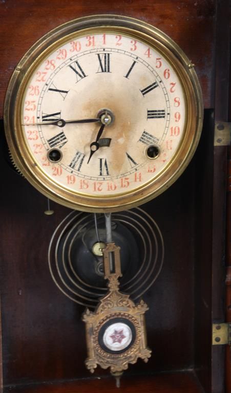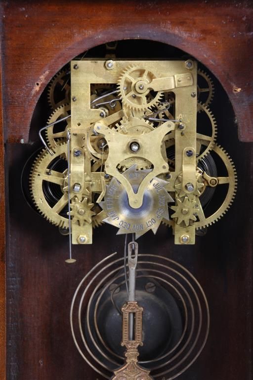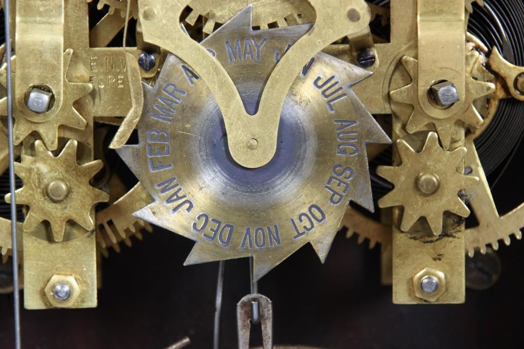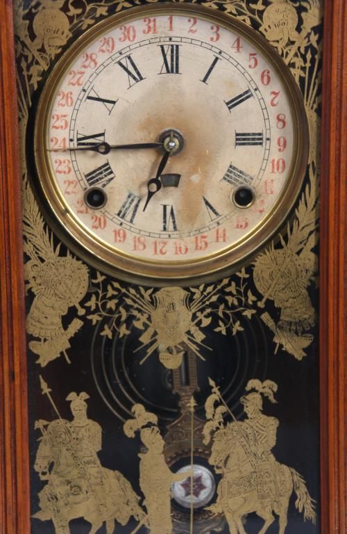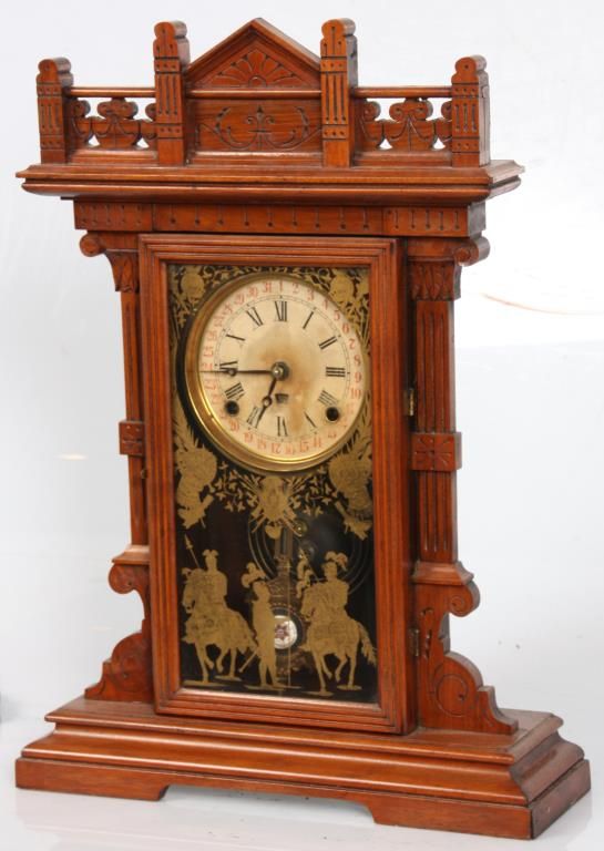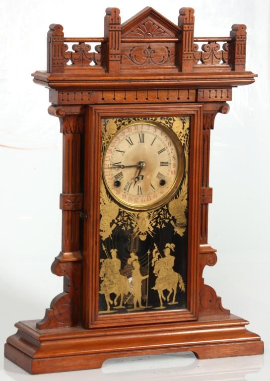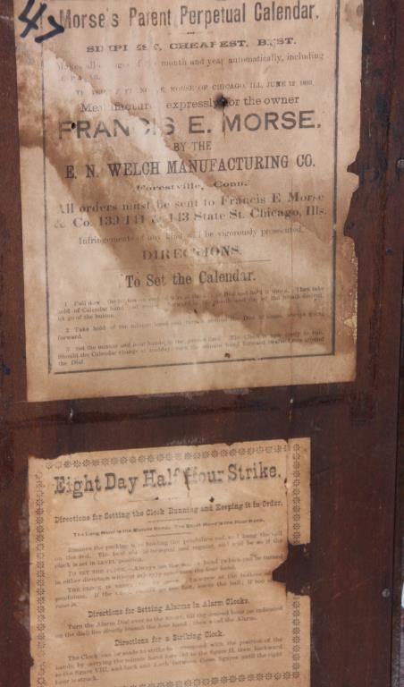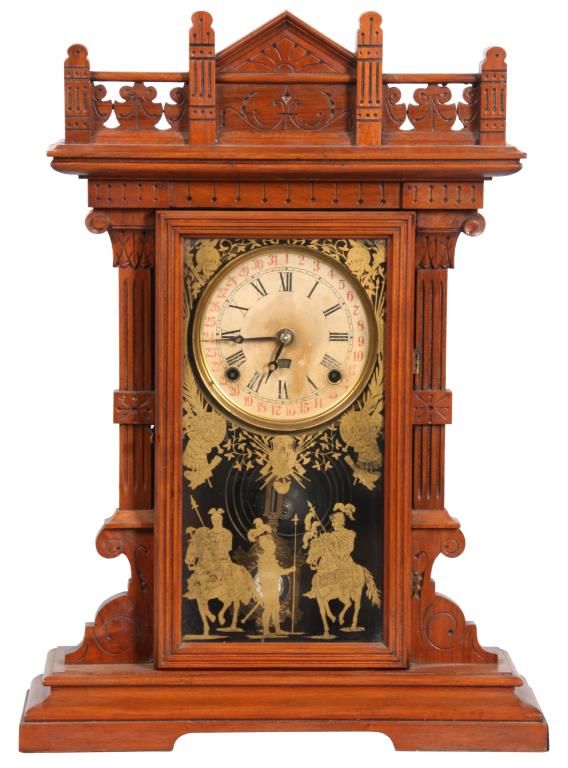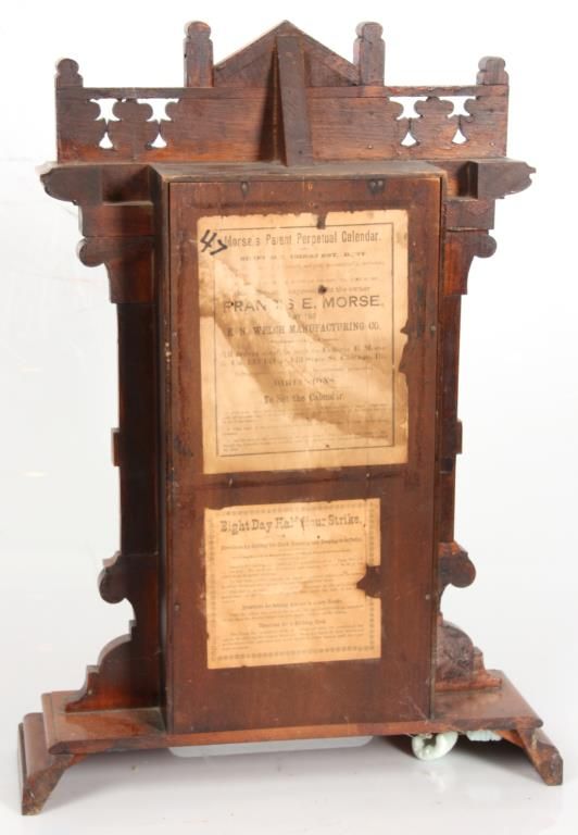 Francis Morse Calendar Mantle Clock. 6 in. paper dial has black Roman hour numerals with 31 date red Arabic numbers outside, black pierced spade hands and brass date indicator; has an aperture cutout at the 6 which exposes the month, incised on a brass toothed disc. Pierced brass spring driven movement has a half hour count wheel strike mechanism with coiled gong, brass pendulum bob with fancy decorated glass center; movement signed E.N. Welch, Mfg. Co. Forrestville, Conn, USA. In a carved E.N. Welch walnut case with pierced carved crest and fluted pilaster side pieces, reverse gold painted door glass has an armored soldier standing between two knights on horseback. In good running condition, original finish; original paper label on the back is in excellent condition and reads “Morse’s Perpetual Calendar, Manufactured expressly for the owner Francis E. Morse, by the E.N. Welch Manufacturing Co.”. 22.5 in. high x 16 in. wide x 5 in. deep.