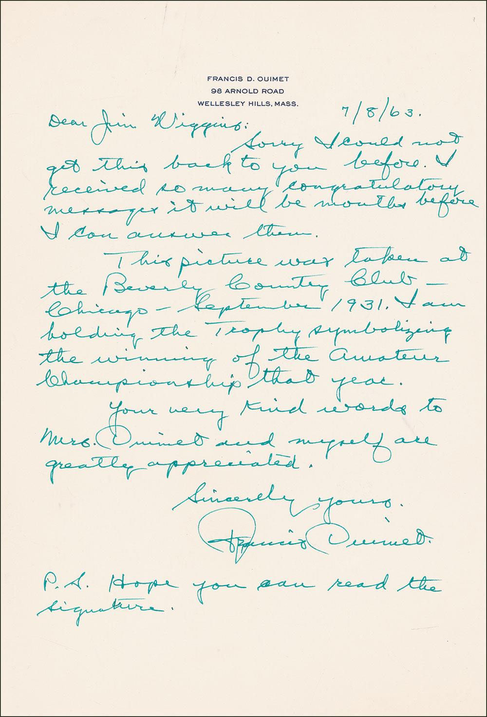 At the 1913 US Open at the Country Club, Ouimet (1893–1967), a former caddy, changed the perceptions of an entire sport with a stunning triumph that captured the imagination of sports fans across the globe. ALS, one page, 7.25 x 10.5, personal letterhead, July 8, 1963. Letter of thanks to a collector which accompanied a signed photo (not included). In part: “I received so many congratulatory messages it will be months before I can answer them. This picture was taken at the Beverly Country Club-Chicago-September 1931. I am holding the trophy symbolizing the winning of the Amateur Championship that year.” Ouimet also adds a brief postscript reading: “Hope you can read the signature.” In fine condition. The first letter we have offered from the winner of ‘the greatest game ever played.’