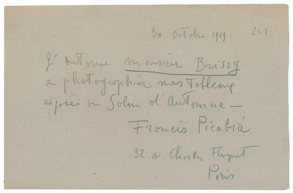 French avant-garde painter, poet, and typographist (1879–1953) who was an early major figure of the Dada movement. ALS in French in pencil, one page, 8 x 4.25, October 30, 1919. In full (translated): "I authorize Mr. Brissy to photograph my paintings exhibited at the Salon d'Automne." In fine condition, with central vertical and horizontal folds, and light creases. Picabia caused a sensation at the 1919 Salon d'Autome with the display of paintings in his machinist style, including 'The Child Carburetor,' the likes of which had not yet been exhibited in Paris.