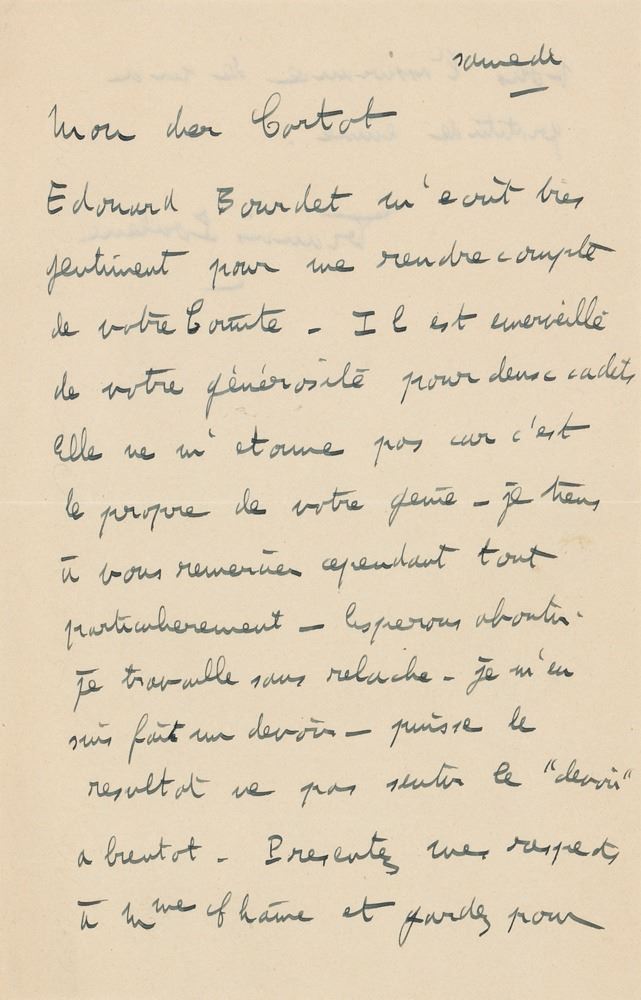 ALS in French, one page both sides, 5.25 x 8.25, no date. An untranslated handwritten letter to French pianist Alfred Cortot, which begins with the mention of playwright Édouard Bourdet. In fine condition.