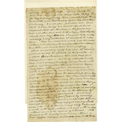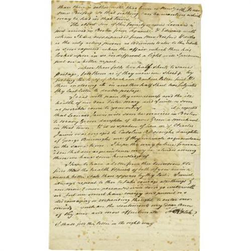 <B>Francis Rotch Autograph Letter Signed</B></I> “<I>F Rotch</B></I>”. Two pages, 7.5” x 12.25”, Surry, August 7, 1816. Francis Rotch was the owner of the ship <I>Dartmouth</B></I> which had the misfortune to be loaded with tea and in Boston Harbor on December 16, 1773. The <I>Dartmouth</B></I> was the unwilling participant in the “Boston Tea Party”. While this letter was written by the ship's owner years after the event, this personal letter does mention Boston and tea, but not in the context of the Boston Tea Party. This letter appears to be written to Rotch's daughter and contains the usual family tidings, including a detailed instruction to his daughter on how to properly fold letters. Tipped on to a backing board via the left margin, some staining which only marginally affects text, and the usual fold creases, else very good. A rare autograph. <I>From the collection of Henry E. Luhrs.</B></I><BR><BR><b>Shipping:</b> Flat Material, Small (<a target="_blank" href="http://www.heritageauctions.com/common/shipping.php">view shipping information</a>)