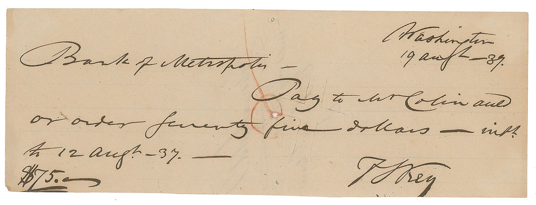ADS, signed “F. S. Key,” one page, 7.75 x 2.75, August 19, 1839. Handwritten pay order, in part: "Bank of Metropolis, Pay to Mr. Colin Auld or order seventy five dollars." In fine condition, with one tiny hole near the cancellation cut.