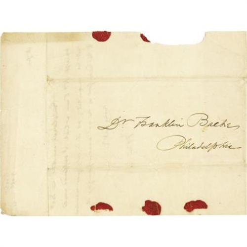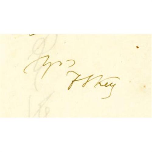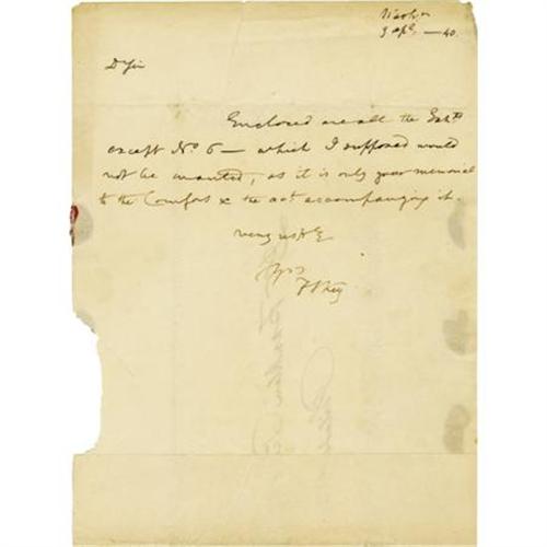 <B>Francis Scott Key Autograph Letter Signed</B></I> “<I>F S Key,</B></I>” one page, 7.75” x 10.25”. Washington, April 9, 1840. Addressed on verso by Key to “<I>Dr Franklin Bache/ Philadelphia.</B></I>” In full, “<I>Enclosed are all the Extr ac ts except No. 6 - which I supposed would not be wanted, as it is only your memorial to the C& the act accompanying it.</B></I>” During the War of 1812, lawyer Francis Scott Key was aboard a British ship in Baltimore harbor on the night of September 13-14, 1814 arranging the release of a client. He was detained while the British bombed Fort McHenry, key to Baltimore defenses. Watching the attack, Key was inspired to write a poem, “The Star-Spangled Banner,” which was later set to music and adopted as the U.S. national anthem in 1931. Dr. Franklin Bache (1792-1864), a surgeon in the War of 1812 and Professor of Chemistry in the Philadelphia College of Pharmacy (1831-1841), was a great-grandson of Benjamin Franklin. Fragments of the original red wax seal on verso shows through at the edges. Portion torn away at blank left edge when letter was opened. Sealed in protective acetate; can be removed without damage.<BR><BR><b>Shipping:</b> Flat Material, Small (<a target="_blank" href="http://www.heritageauctions.com/common/shipping.php">view shipping information</a>)