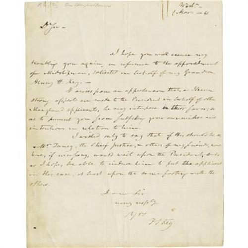 <B>Francis Scott Key Autograph Letter Signed,</B></I> "<I>F S Key</B></I>", one page with address panel on verso, 8" x 10", Washington, D. C., March 1, 1841, to J. H. Paulding, Secretary of the Navy, Washington, D.C. The letter reads: "<I>I hope you will excuse my troubling you again in reference to the appointment of Midshipman, solicited on behalf of my grandson, Henry H. Key. It arises from an apprehension that as I learn strong appeals are made to the President in behalf of other Maryland applicants, he may interpose in their favor, so as to prevent you from fulfilling your own wish and intention in relation to him. I wish only to say that if this should be so, Mr. Taney, the Chief Justice, and others of my friends, now here, if necessary, would wait upon the President, and as I hope, be able to induce him to put the applicant in this case, at least upon the same footing with the others.</B></I>" Paperclip stain along top margin, small collector's pencil notations, old paper residue on verso from mounting. Very good condition. <I>Ex. Henry E. Luhrs Collection.</B></I><BR><BR><BR><b>Shipping:</b> Flat Material, Small (<a target="_blank" href="http://www.heritageauctions.com/common/shipping.php">view shipping information</a>)