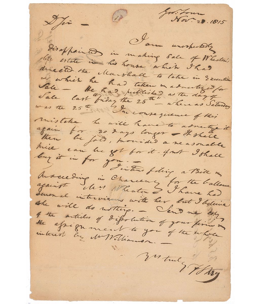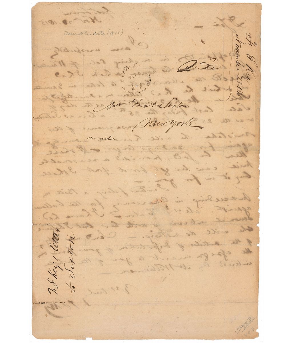 Baltimore lawyer (1779–1843) who was inspired to write the ‘Star-Spangled Banner’ after he witnessed the bombardment of Fort McHenry by the British in 1814. ALS signed “F. S. Key,” one page, 7.75 x 11.5, November 28, 1815. Letter to Mr. Thomas Sexton of N