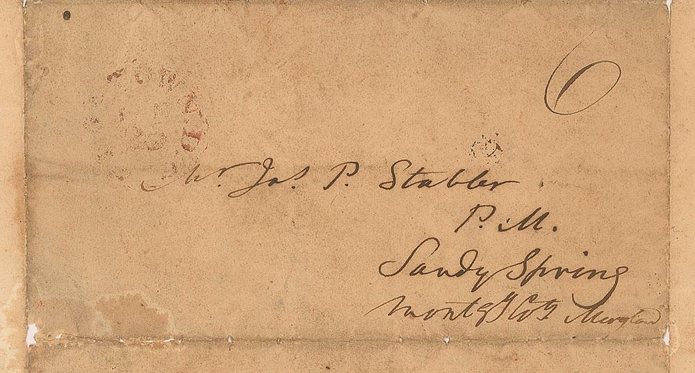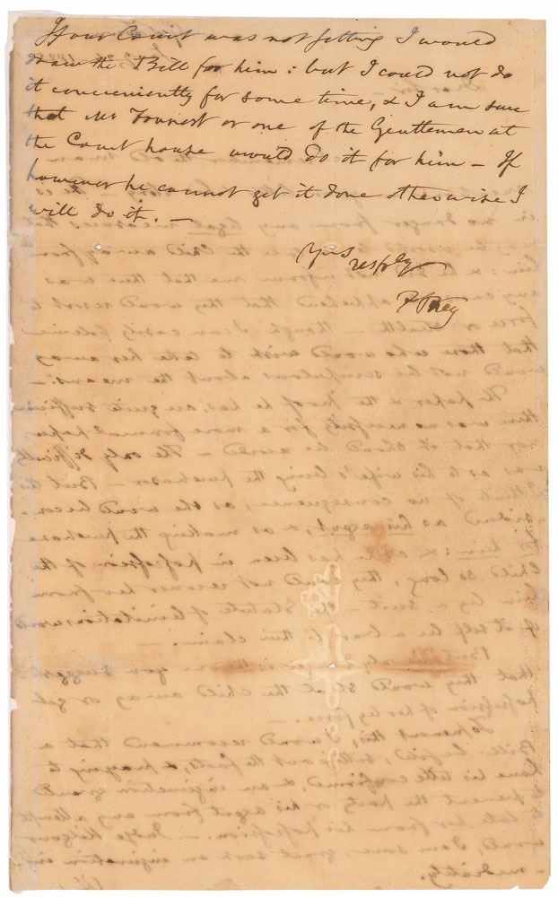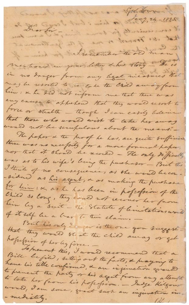 ALS, signed “F. S. Key,” one page both sides, 7.5 x 12.5, January 24, 1825. Letter to James Stabler, in full: “I remember the old man mentioned in your letter & his story—He is in no danger from any legal measures that may be resorted to take the child away from him: & he did not inform me that there was any cause to apprehend that they would resort to force or stealth—though I can easily believe that those who would wish to take her away would not be scrupulous about the means. The paper & the proof he has, are quite sufficient there was no necessity for a more formal paper, nor that it should be recorded—The only difficulty was as to his wife’s being the purchaser—But this I think is of no consequence, as she would be considered as his agent, & as making the purchase for him: & as he has been in possession of the child so long, they could not recover her from him by a suit—the Statute of limitations would of it self be a bar to their claim. But his only danger is the one you suggest—that they would steal the child away or get possession of her by force. To prevent this, I would recommend that a Bill be filed, setting out the facts, & praying to have his title confirmed, & an injunction granted to prevent the party or his agent from any attempt to take her from his possession. Judge Kilgour would, I am sure, grant such an injunction immediately. If our Court was not sitting I would draw the Bill for him: but I could not do it conveniently for some time, & I am sure that Mr. Forrest or one of the Gentlemen at the Court house would do it for him—If however he cannot get it done otherwise I will do it.” Reverse of second integral page is addressed in Key’s hand to “Mr. Jas. P. Stabler, P.M., Sandy Spring, Mont. Co. Maryland.” Small separations along intersecting folds and hinge, chipping to edges, scattered toning and dampstaining, and paper loss to second integral page, otherwise very good condition.
