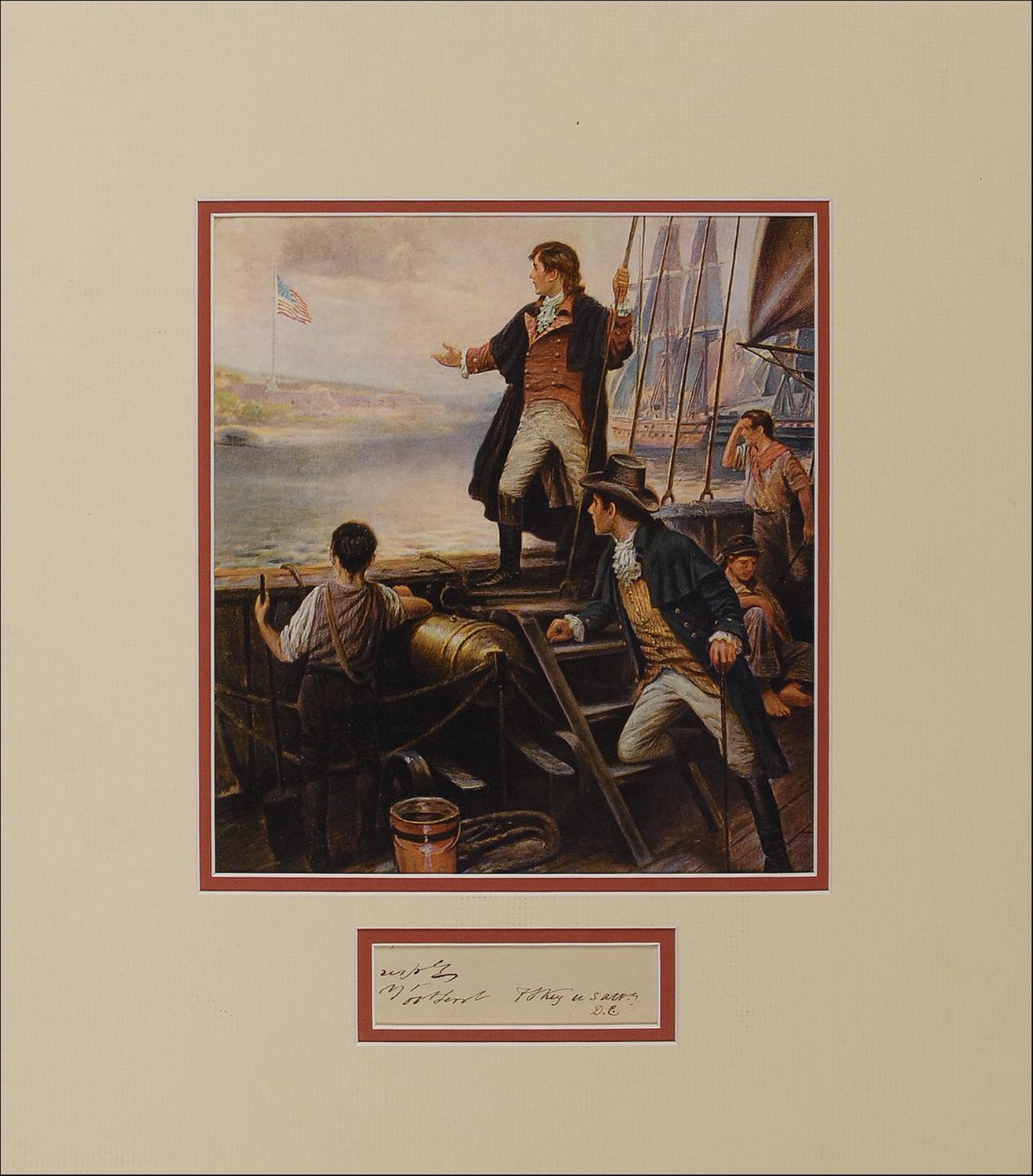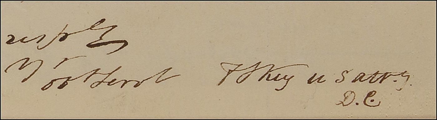 Baltimore lawyer (1779–1843) who was inspired to write the “Star-Spangled Banner” after he witnessed the bombardment of Fort McHenry by the British in 1814. Ink signature, “F. S. Key, US Atty, D.C.,” on an off-white slip. Double matted with a color image of Key looking at Fort McHenry from his ship, to an overall size of 14 x 16. In fine condition, with two vertical folds, one through a single letter of signature, and a crease to lower right corner.