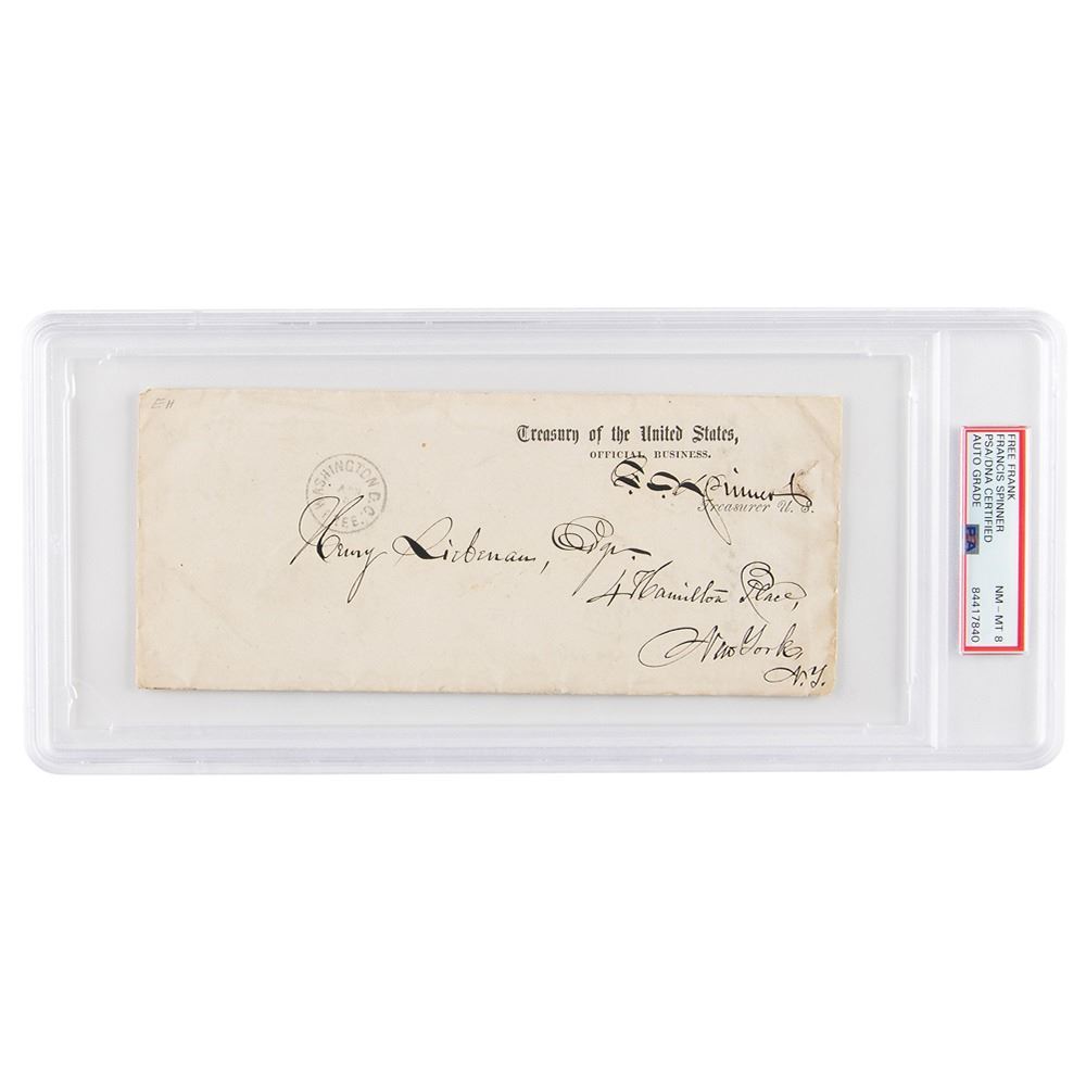 Hand-addressed Treasury of the United States mailing envelope, 8.5 x 3.5, filled out by Francis Spinner, who addresses the envelope to “Henry Lieberman, Esqr, 4 Hamilton Place, New York, N.Y.,†and adds his franking signature above, “F. E. Spinner.†In very good to fine condition, with overall soiling. Encapsulated in a PSA/DNA authentication holder, grading the autograph as "NM-MT 8."