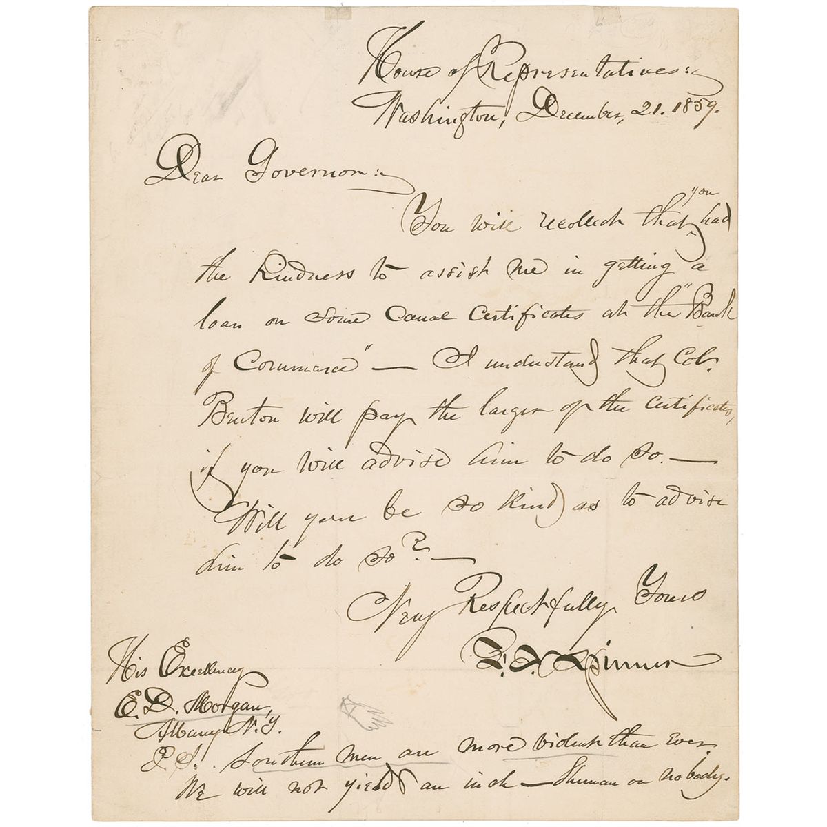 US treasurer during the Civil War who is credited with bringing women into the civil service. LS signed “F. E. Spinner,” one page, 7.75 x 9.75, December 21, 1859. Letter to New York governor E. D. Morgan. In part: “You will recollect that you had the kindness to assist me in getting a loan on some canal certificates at the Bank of Commerce. I understand that Col. Burton will pay the larger of the certificates.” A postscript under Spinner’s signature reads, “Southern men are more violent than ever. We will not yield a inch—Sherman or nobody.” In very good condition, with intersecting mailing folds, several passing through signature, scattered soiling, small pencil notation under signature, erased notations to top left, and light tape remnants to top edge. Strong anti-Southern sentiment two years before the outbreak of the Civil War.
