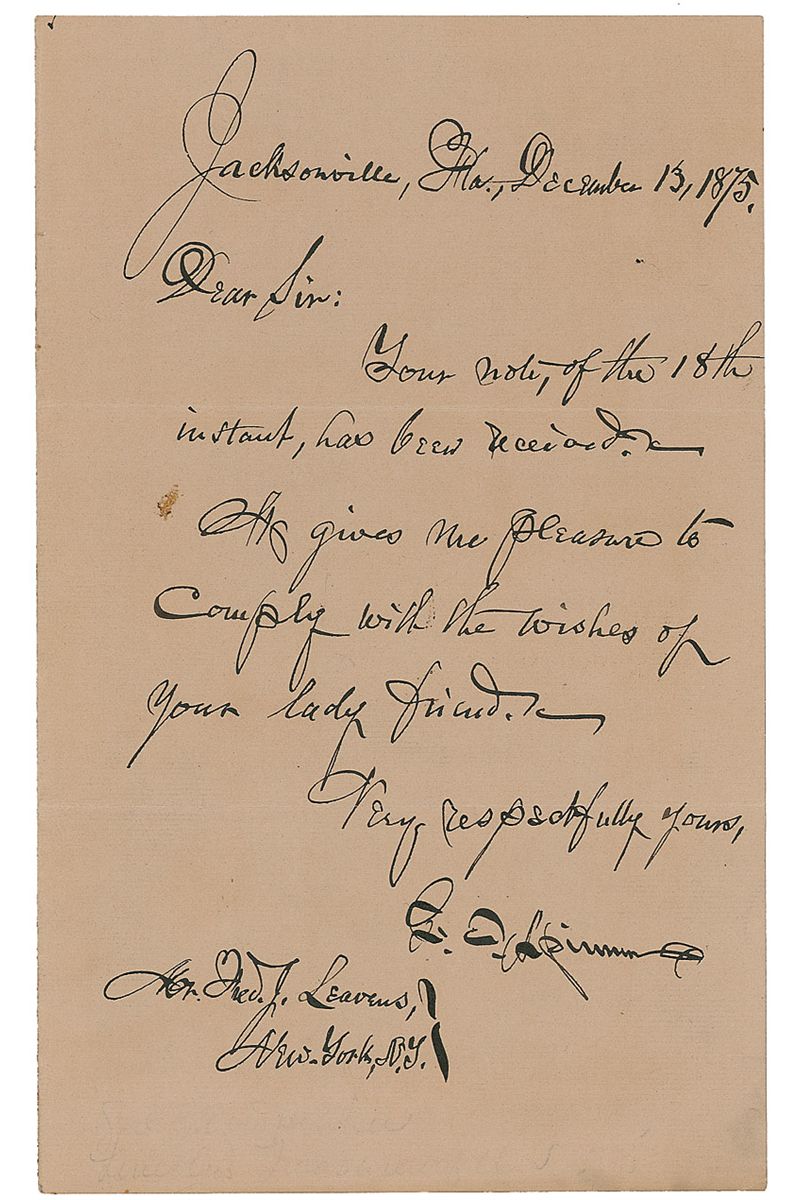 US treasurer during the Civil War who is credited with bringing women into the civil service (1802–1890). ALS signed “F. E. Spinner,” one page, 5 x 8, December 13, 1875. Letter to Frederick J. Leavens. In part: “Your note…has been received. It gives me pleasure to comply with the wishes of your lady friend.” In fine condition, with a speck of toned adhesive to the left side.