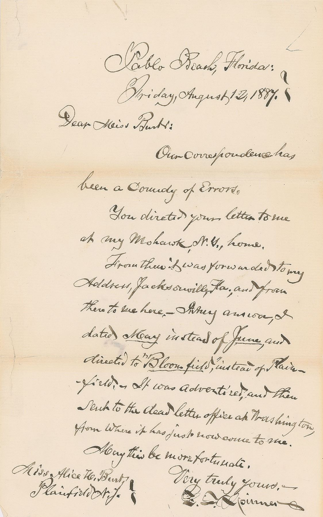 Two items: a Mohawk Valley Bank pay order in the amount of $79.60, filled out and signed by Spinner as cashier, "F. E. Spinner"; and an ALS signed "F. E. Spinner," one page, August 12, 1887, in part: "Our correspondence has been a comedy of errors. You directed your letter to me at my Mohawk, N.Y. home. From there it was forwarded to my Address, Jacksonville Fla., and from there to me here—In my answer, I dated May instead of June, and directed to 'Bloomfield' instead of Plainfield." In overall fine condition.