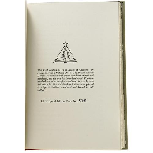 <B>Francis Stevens Gertrude Bennett : Special Limited Edition of<I> The Heads of Cerberus.</B></I></B></I> (Reading: Polaris Press, 1952), number five of a special presentation edition of ten, 190 pages, illustrated by Ric Binkley, errata page laid in, half leather with gray cloth boards and gilt titles, 8vo (6.25" x 9"), beautiful copy with a beautiful jacket, probably added at a later date. Offered with a sunned slipcase as issued. One of only two titles printed by this publisher. <I>From the Ventura Collection.</B></I><BR><BR><b>Shipping:</b> Books & Catalogs (<a target="_blank" href="http://www.heritageauctions.com/common/shipping.php">view shipping information</a>)
