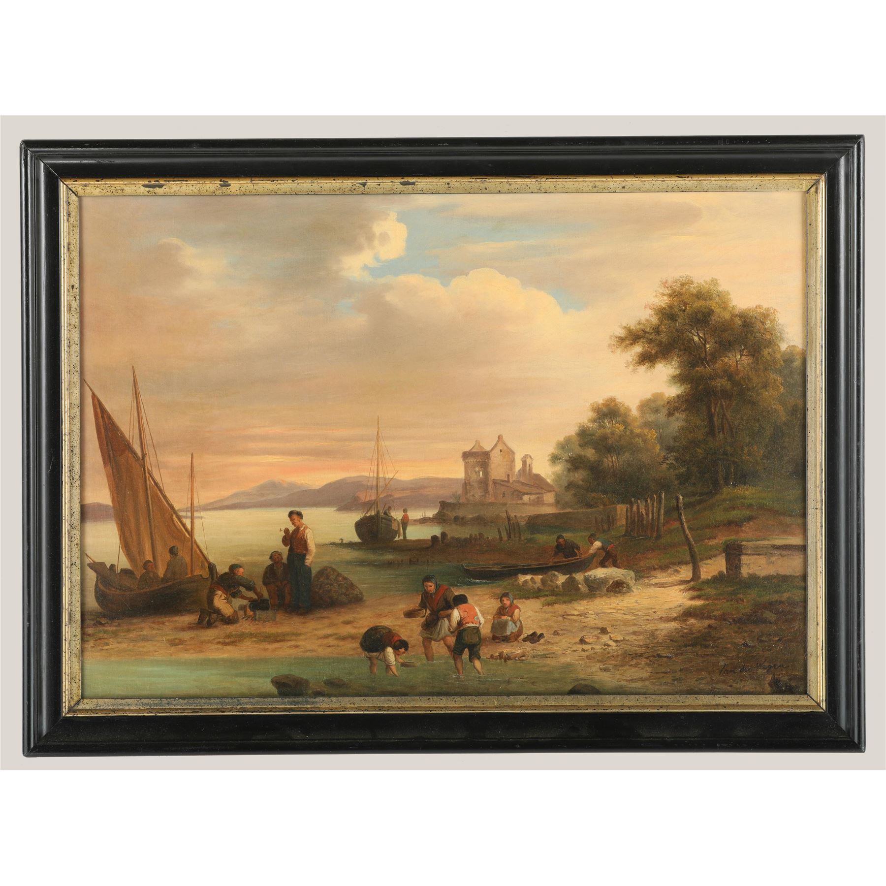 An original oil on canvas, attributed to Francis Van der Weegen, titled, "Seaside With Fisherfolk", signed 'van der Wegen' lower right. Image- 20 3/4" x 28". Frame- 24" x 32".