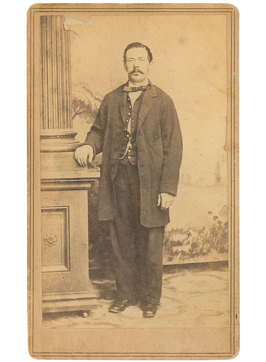 Union naval engineer who served as an assistant engineer on board the USS Penguin. Original unsigned 2.25 x 4 full-length carte-de-visite photo by A. Constant of New Orleans. In very good condition, with a few small tears and areas of surface loss to image and some scattered light toning and soiling.