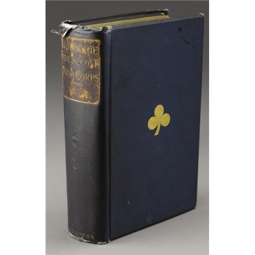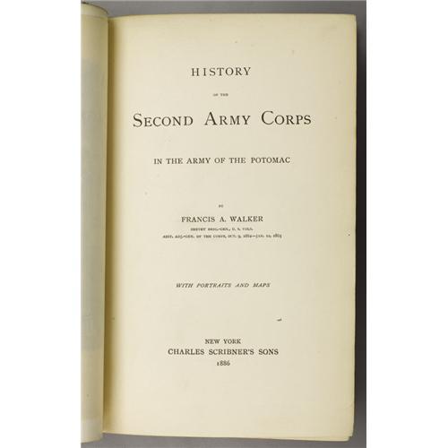 <B>Francis A. Walker: <I>History of the Second Army Corps in the Army of the Potomac</B></I>.</B></I> (New York: Charles Scribner's Sons, 1886), first edition, 737 pages, blue cloth with gilt lettering on the spine and front board, leather title stamp affixed to spine, top edge gilt, 8vo (6” x 8.5”), no dust jacket. Profusely illustrated with maps, portraits, and charts. The book is in good condition, with minor corner, edge and spine wear present, as well as minor staining and rubbing on the boards. Both hinges starting inside, though the textblock is largely clean. An attractive volume of history for one of the five original corps organized by Lincoln in 1862.<BR><BR><b>Shipping:</b> Books & Catalogs (<a target="_blank" href="http://www.heritageauctions.com/common/shipping.php">view shipping information</a>)