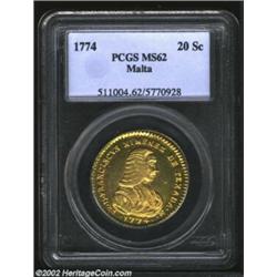 Francis Ximenez gold 20 scudi 1774, Bust right with date below/Crowned shields and value, F-41, KM-2