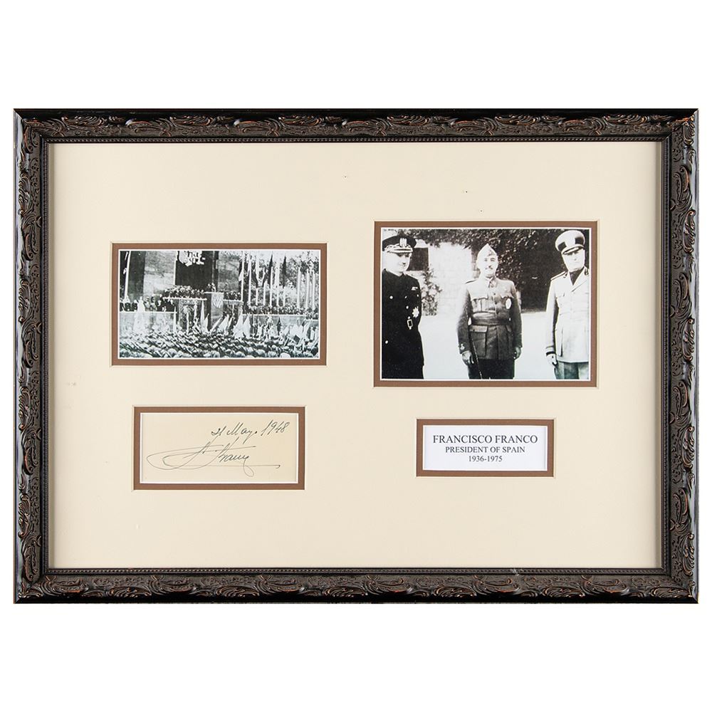 Vintage ink signature, "F. Franco, 21 Mayo 1948,†on an off-white 5 x 2 slip. Double-matted and framed with two images and a caption to an overall size of 21.25 x 15.5. In fine condition.