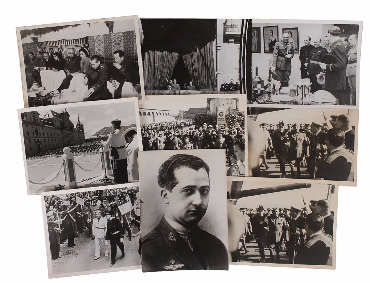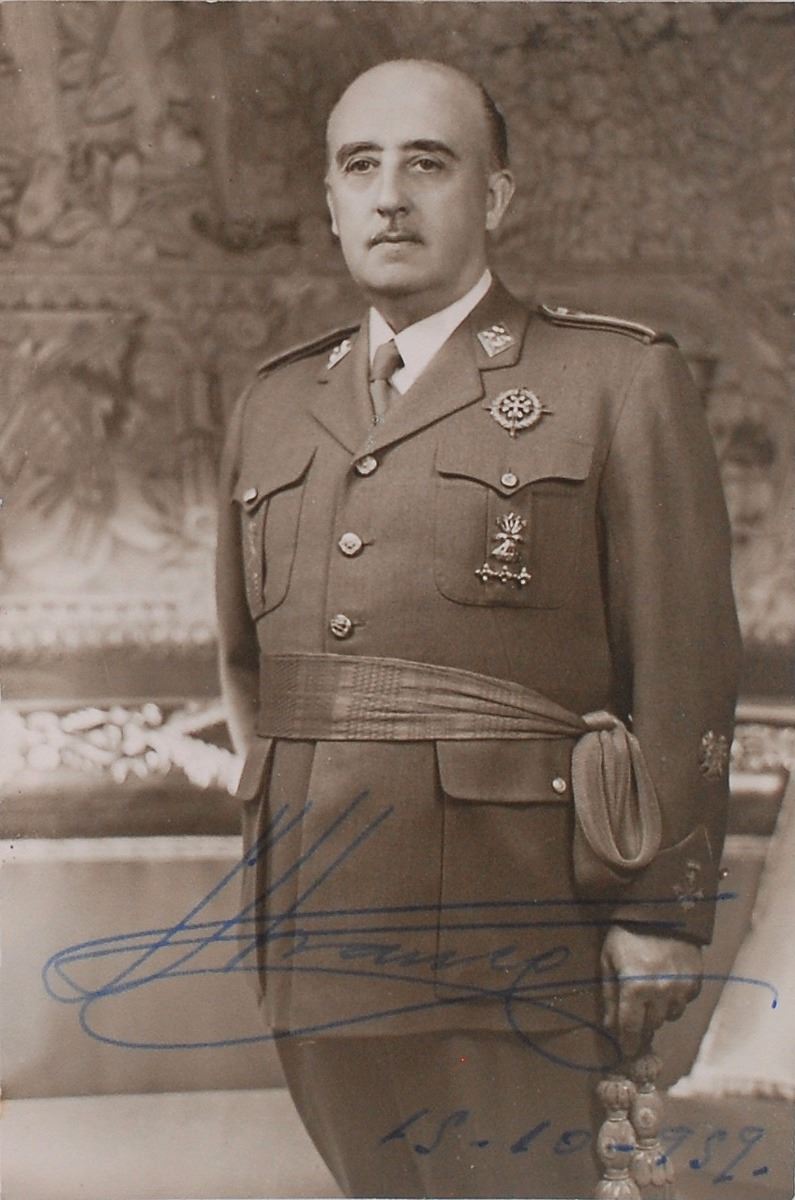 Matte-finish 3.5 x 5.25 three-quarter length portrait of Franco in his military uniform by Jalon Angel, signed in blue fountain pen, “F. Franco, 15.10.959.” In fine condition, with trivial wear to edges and mounting remnants to reverse. Accompanied by a group of nine unsigned glossy World War II-era photos of Franco, with the reverse of each bearing photography stamps and affixed captions.