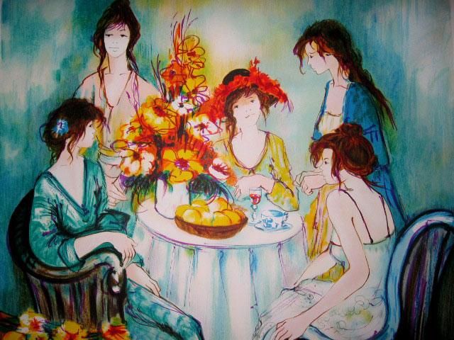 A group of ladies gather around a table for tea, in this cozy art print. * Artist: Franck L Title: Ladies Tea Medium: Lithograph on paper Sheet size: 23" x 17-1/2" Condition: Excellent