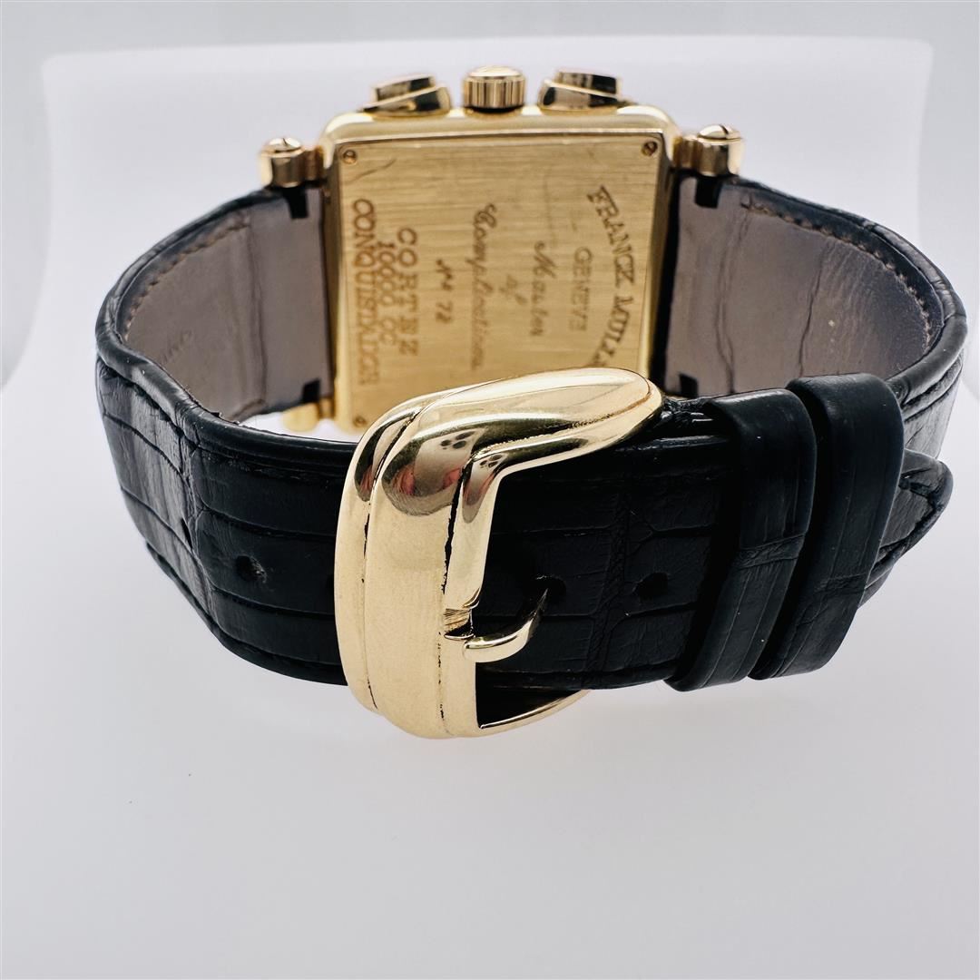 One Franck Muller Conquistador Cortez Chronograph RG Black Lacquered Dial 10000 CC. Franck Muller 10000 CC Conquistador Cortez Chronograph "Master of Complications" 18kt Yellow Gold, Black Lacquered Dial with Luminescent Arabic Hour Markers. Features skeletonized baton luminous hands with luminous, and there is a center sweep seconds hand with a luminous red arrow pointer. A circular date aperture window is at the 6 o'clock position. Self-Winding Chronograph Automatic Movement. Fitted on a Black Alligator Leather Strap with 18kt Gold Tongue Buckle, 54mm x 41.1mm Franck Muller is world-famous for its Grand Complications and Luxury watches are exceptionally recognizable. Franck Muller watches are one of the finest and most complicated in the world. The manufacture was founded in Geneva by Franck Muller and Vartan Sirmakes with the aim of creating exclusive timepieces characterized by complicated movements and original designs. Thanks to its strong in-house capabilities in numerous fields of Haute Horlogerie, this company rapidly became one of the best Swiss Horlogerie brands. The company's distinctive design characteristics include atypically shaped cases, Art Deco inspired dials, spade hands, and unique Arabic or Roman numerals. In recent years, Franck Muller has become well-known for the tonneau or barrel-shaped case. A trained master watchmaker from the Swiss town of La Chaux-de-Fonds, Franck Muller has always sought to produce timepieces unlike any other. In doing so, he has managed to bring a breath of fresh air into the watch industry while also honoring the traditions of "haute horlogerie."