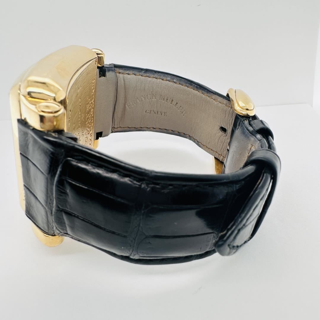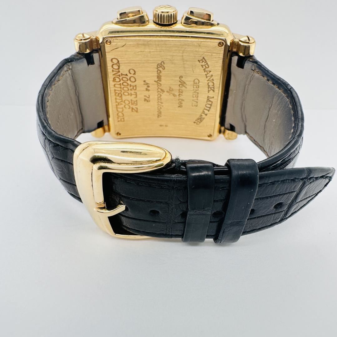 One Franck Muller Conquistador Cortez Chronograph RG Black Lacquered Dial 10000 CC. Franck Muller 10000 CC Conquistador Cortez Chronograph "Master of Complications" 18kt Yellow Gold, Black Lacquered Dial with Luminescent Arabic Hour Markers. Features skeletonized baton luminous hands with luminous, and there is a center sweep seconds hand with a luminous red arrow pointer. A circular date aperture window is at the 6 o'clock position. Self-Winding Chronograph Automatic Movement. Fitted on a Black Alligator Leather Strap with 18kt Gold Tongue Buckle, 54mm x 41.1mm Franck Muller is world-famous for its Grand Complications and Luxury watches are exceptionally recognizable. Franck Muller watches are one of the finest and most complicated in the world. The manufacture was founded in Geneva by Franck Muller and Vartan Sirmakes with the aim of creating exclusive timepieces characterized by complicated movements and original designs. Thanks to its strong in-house capabilities in numerous fields of Haute Horlogerie, this company rapidly became one of the best Swiss Horlogerie brands. The company's distinctive design characteristics include atypically shaped cases, Art Deco inspired dials, spade hands, and unique Arabic or Roman numerals. In recent years, Franck Muller has become well-known for the tonneau or barrel-shaped case. A trained master watchmaker from the Swiss town of La Chaux-de-Fonds, Franck Muller has always sought to produce timepieces unlike any other. In doing so, he has managed to bring a breath of fresh air into the watch industry while also honoring the traditions of "haute horlogerie."