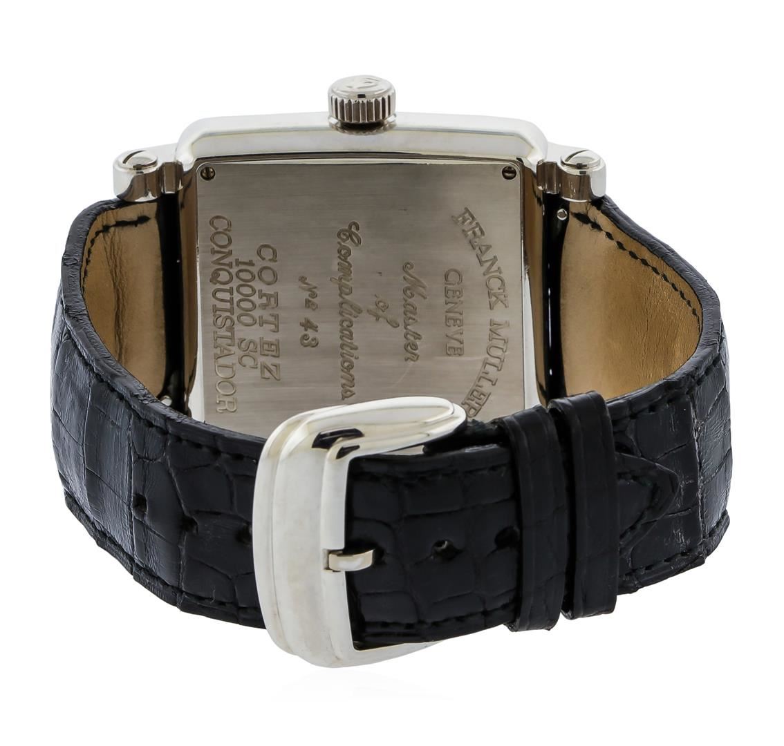 One, Franck Muller Cortez Conquistador Wristwatch, electronically tested 18KT White gold, Swiss Hallmarked Franck Muller Case: 41mm x 41mm, Case Back: secured by four set screws, engraved with the manufacturers name, model no. information, and ID numbers, Crown: logo'd, Bezel: fixed & polished, Crystal: domed anti-reflective sapphire crystal, Movement: Swiss automatic. Power Reserve: approximately 42 hours. Franck Muller signed Dial: Silvered, with guilloche, blue steel luminous hands, and luminous numerals, Date Window: at the 6 o'clock position, Franck Muller Bracelet: saddle stitched leather strap, nine inch length adjustable, 18KT White gold Franck Muller clasp. Condition: G-5 Fine. Total Weight of Watch 181.36gm. AIG Appraised at $17,000.00.