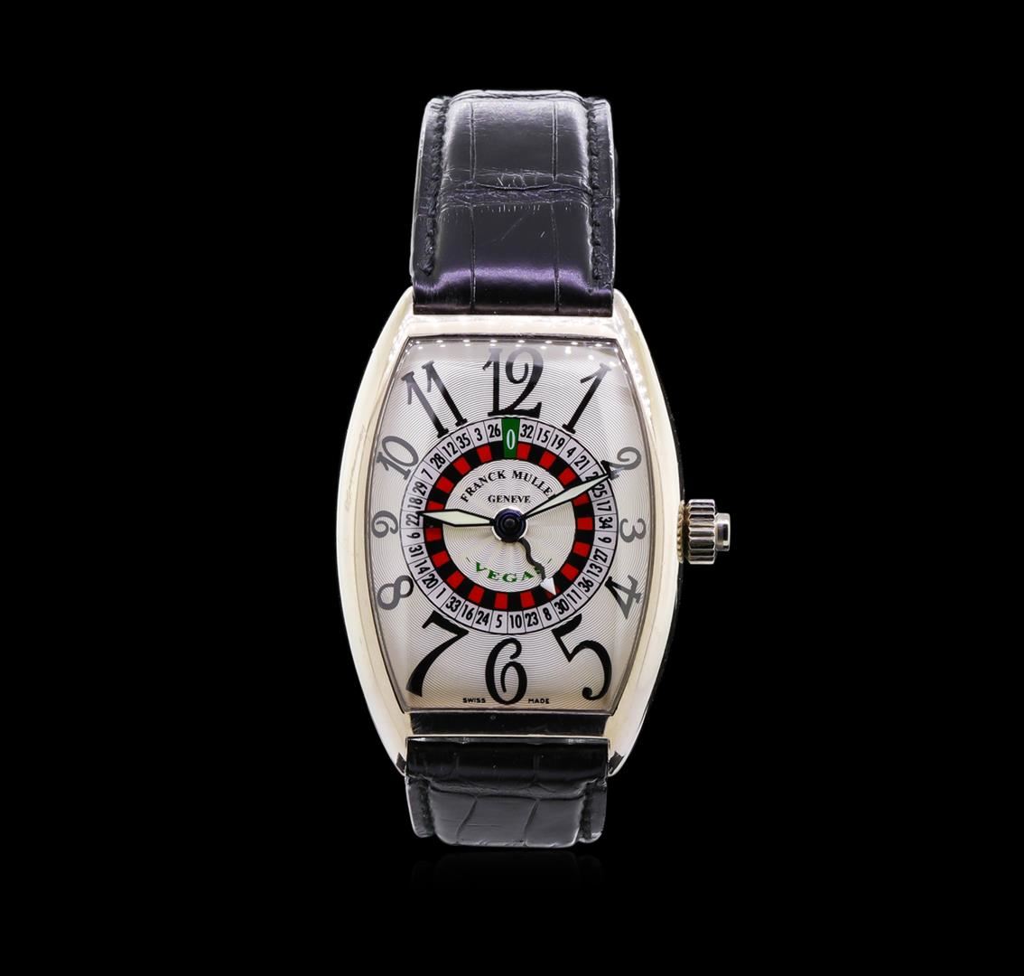 One Franck Muller Vegas watch featuring: Case: 47mm x 34mm 18KT white gold. Dial: Silver with roulette wheel, Arabic numerals. Bezel: 18KT white gold. Bracelet: black leather with 18KT white gold buckle. Movement: Automatic. Crystal: Sapphire. Condition: Light scratches on case, roulette wheel is functional and overall in great condition.